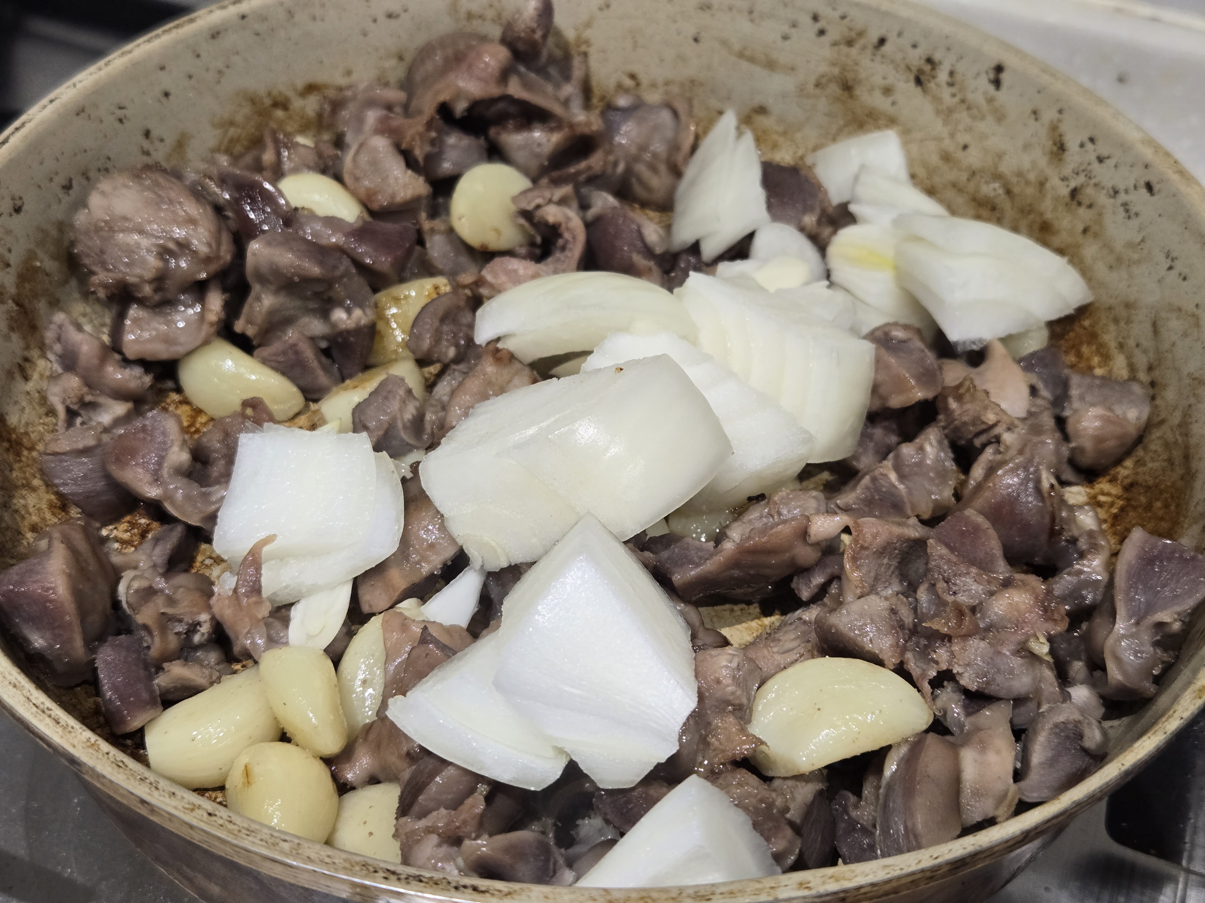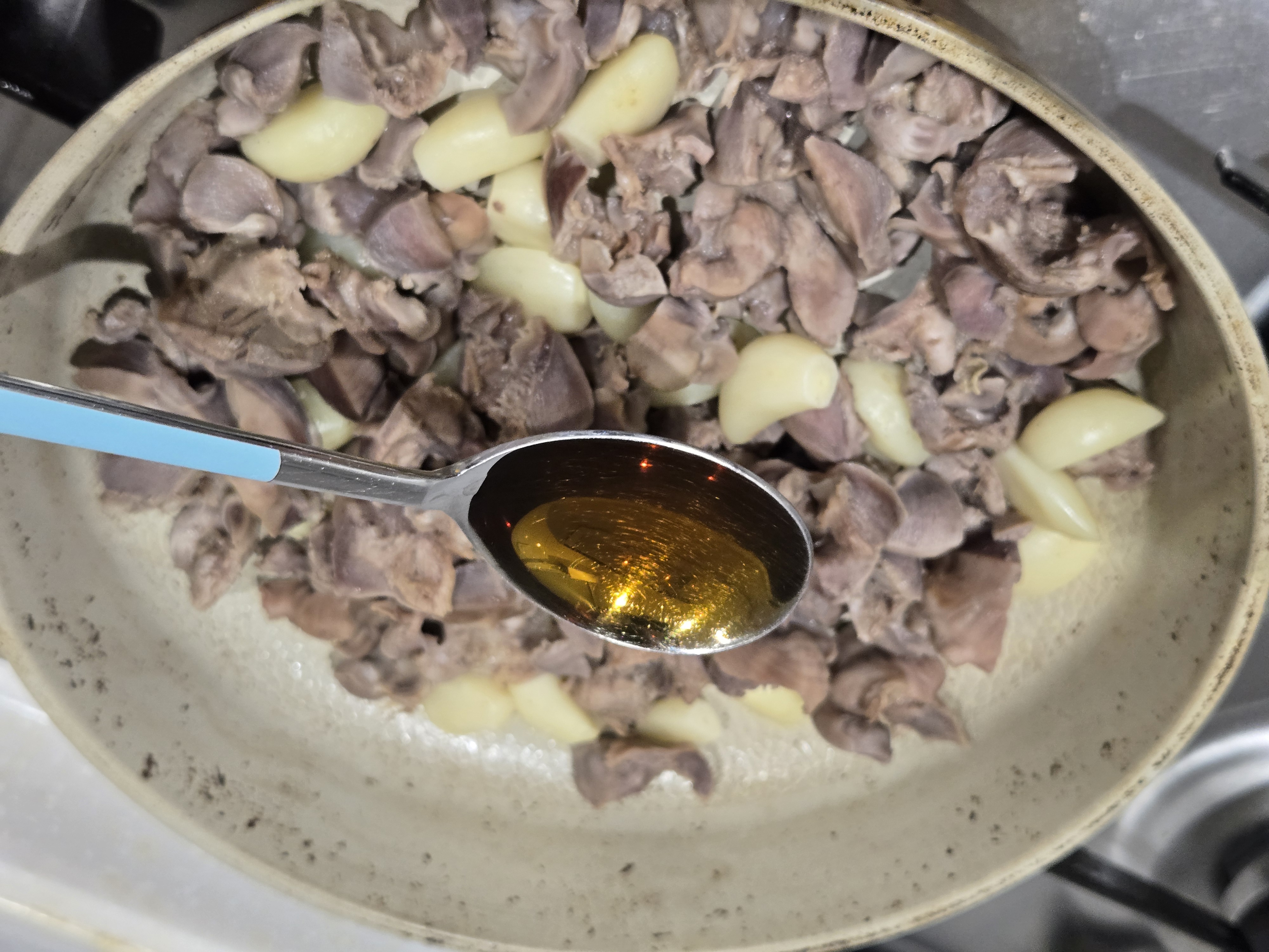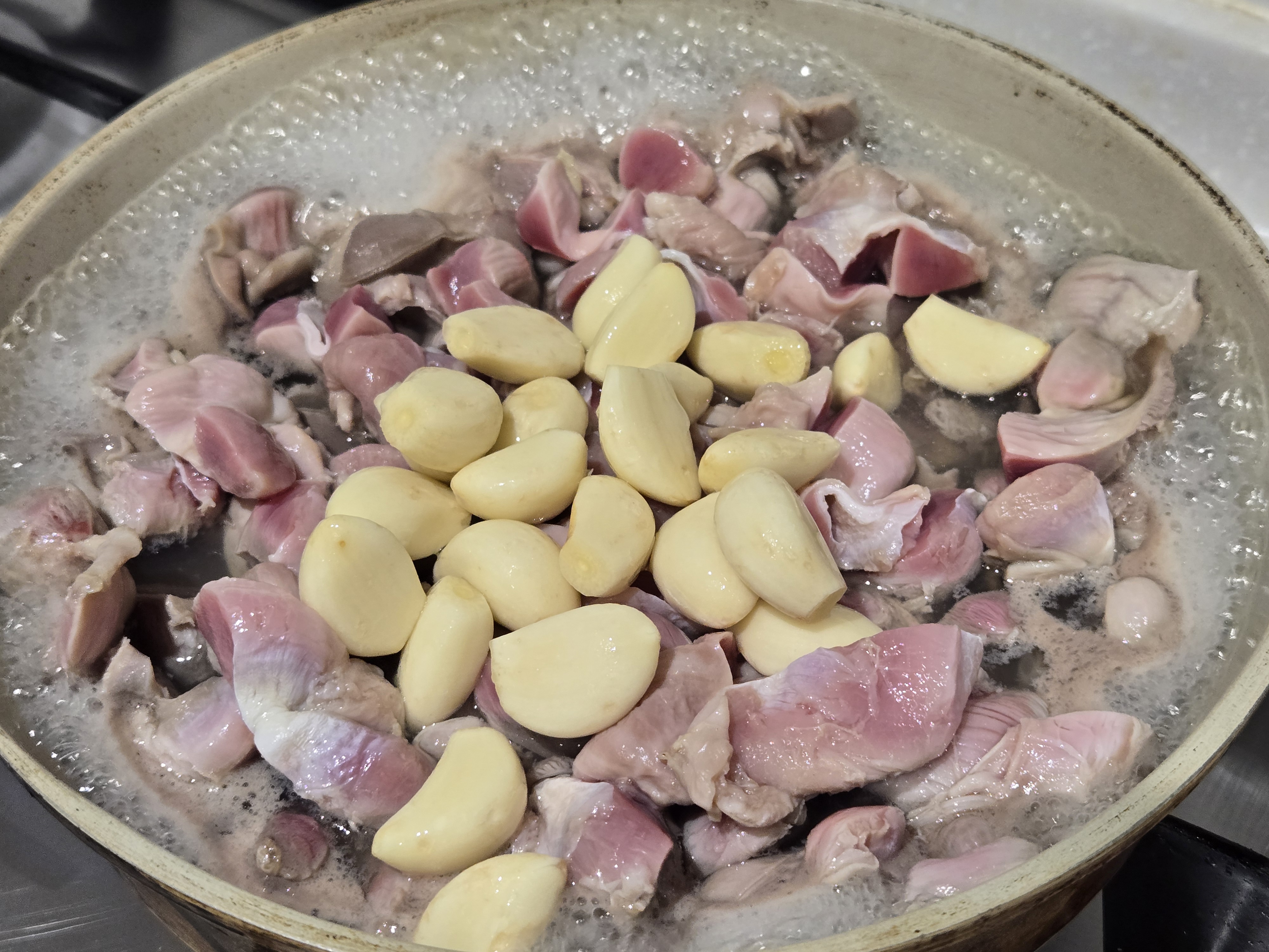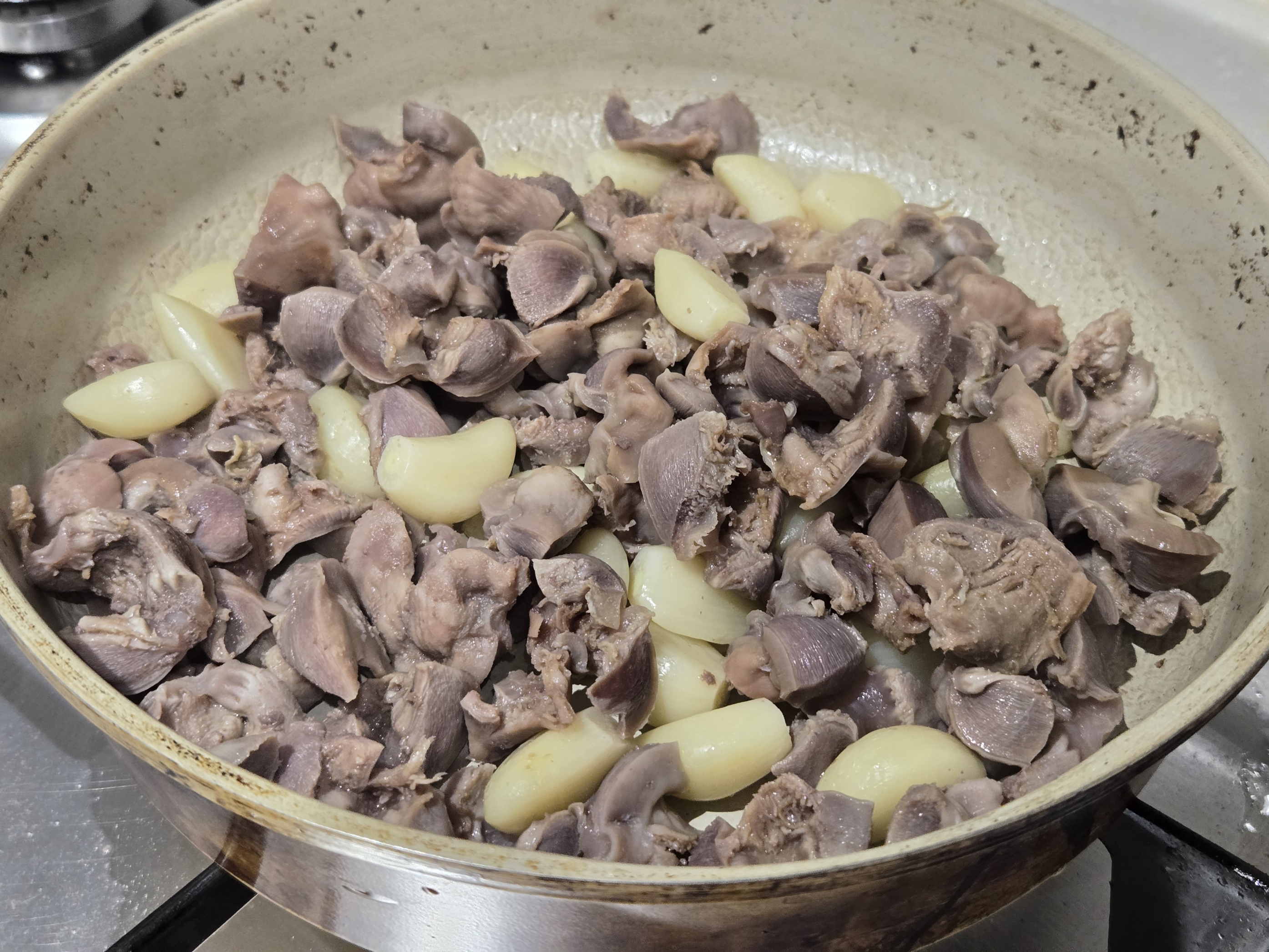 팬에 손질한 닭똥집과 마늘을 넣고