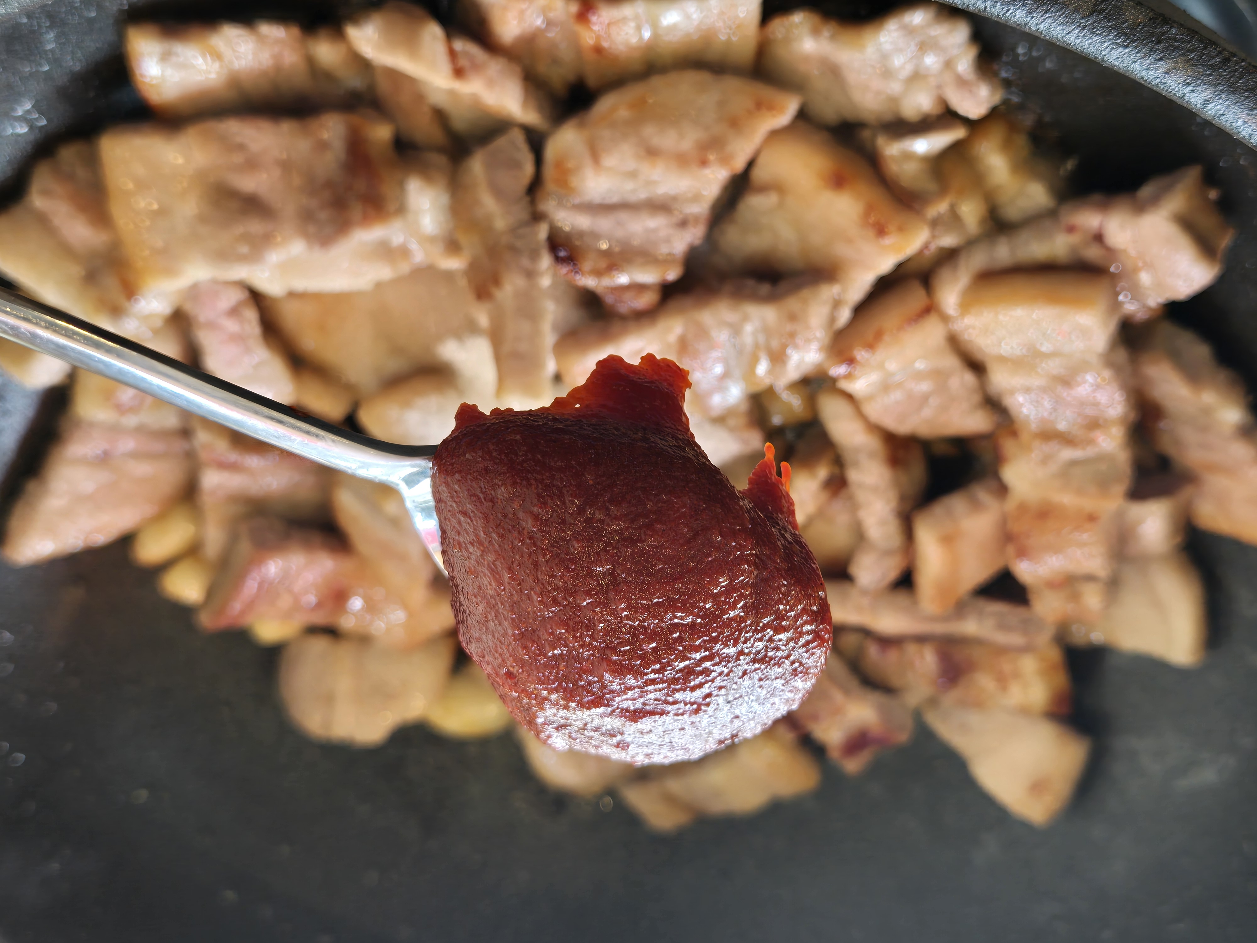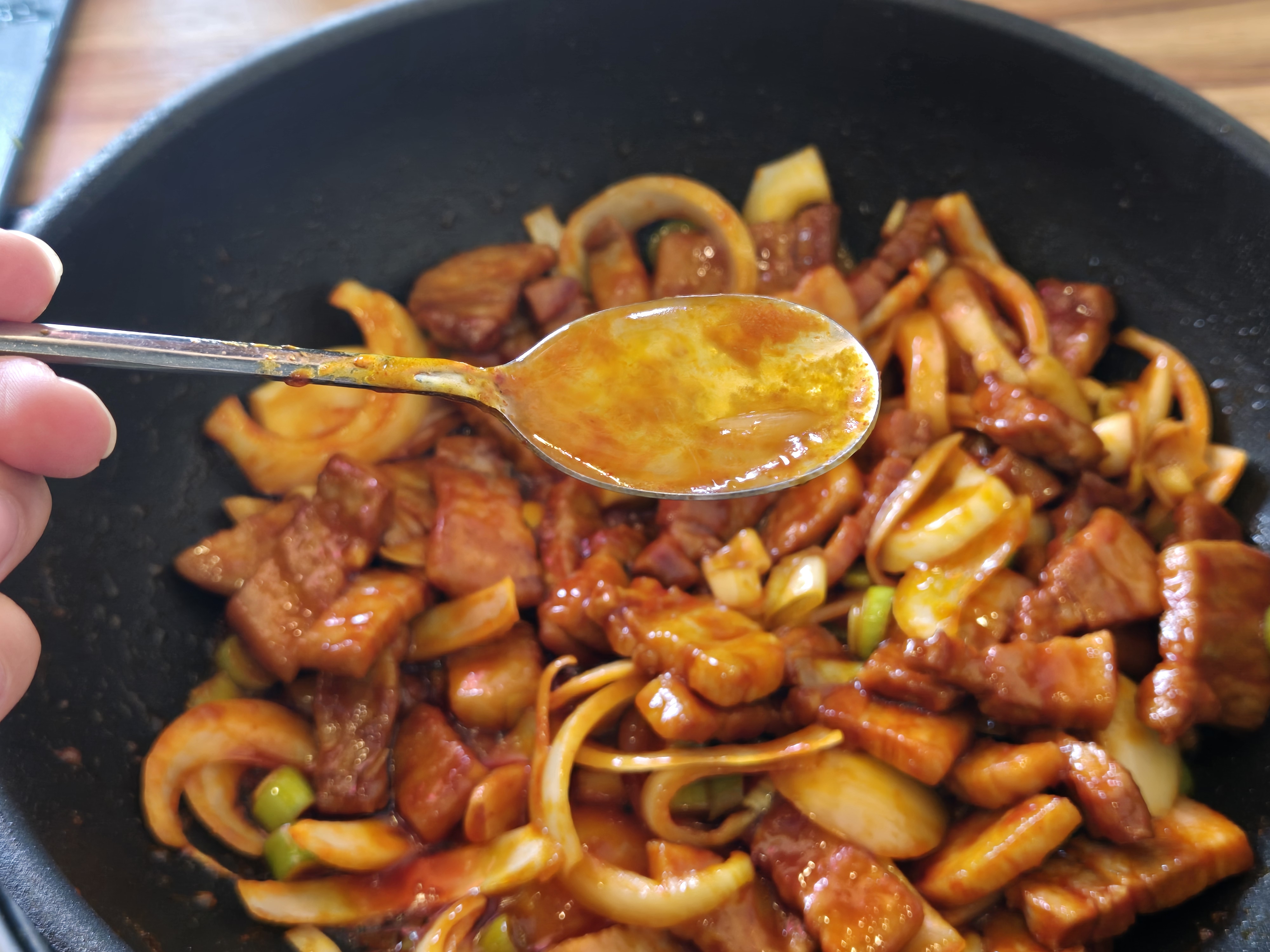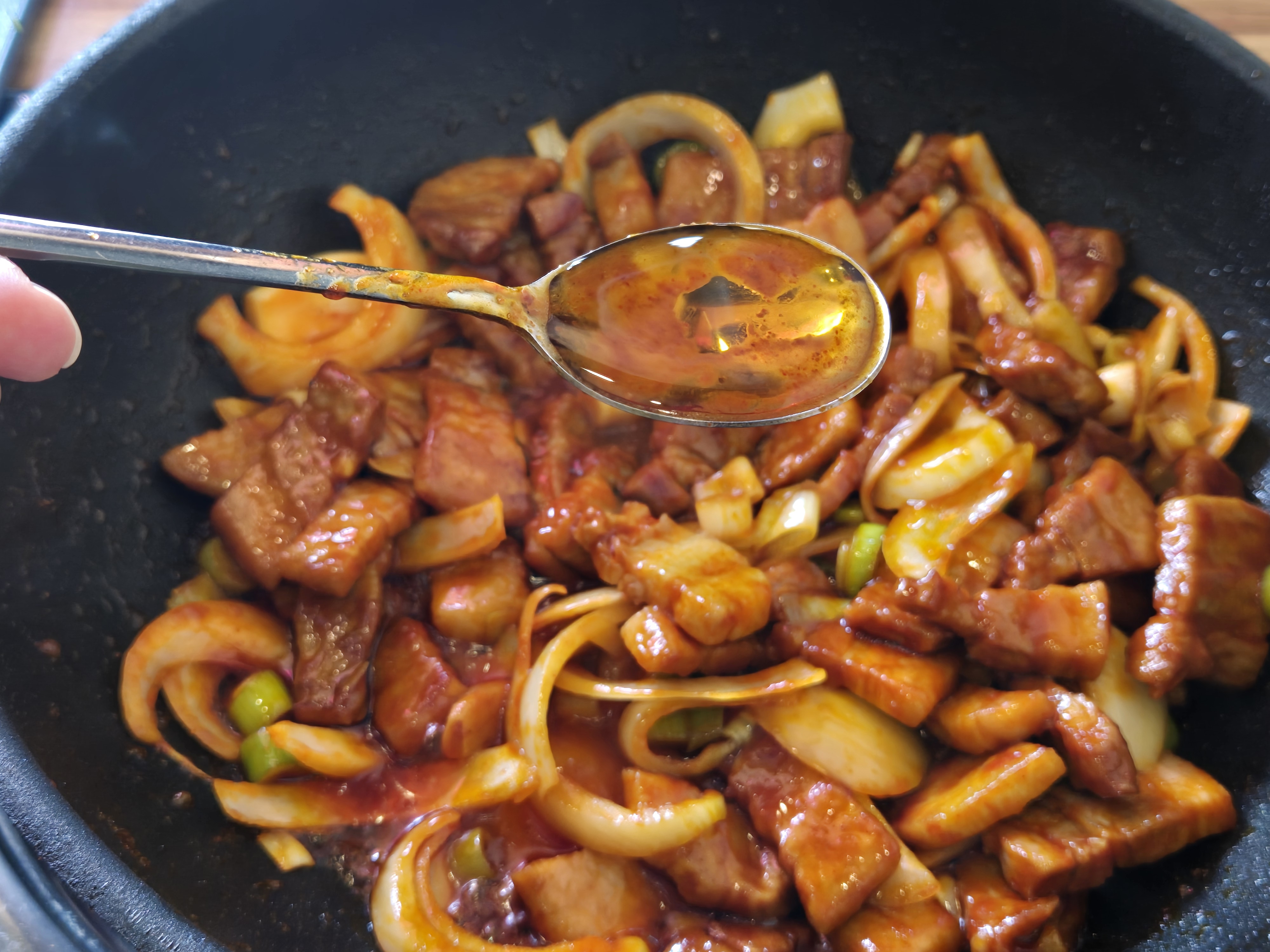 팬에 늘러붙은 양념을 긁어가며