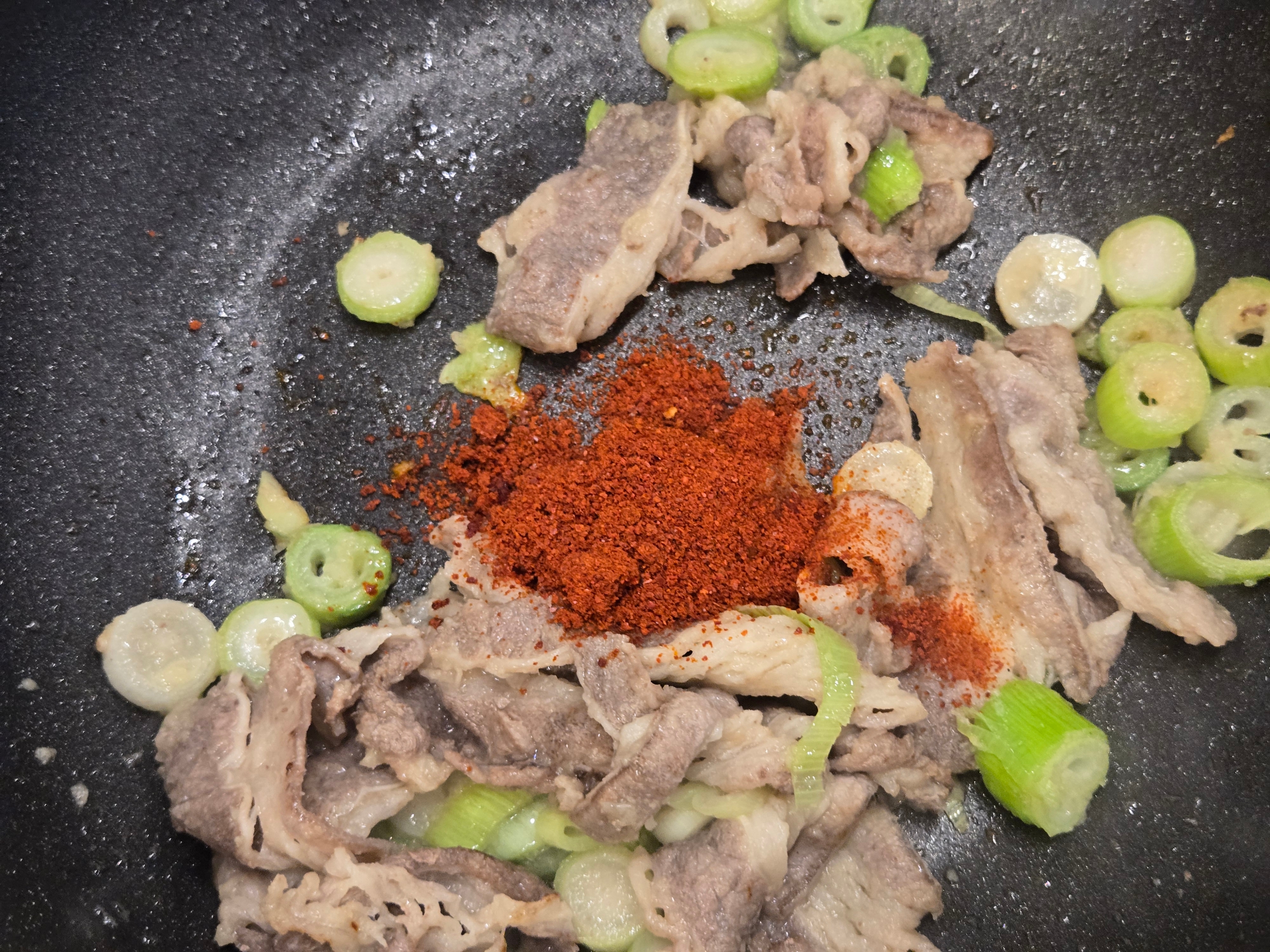 약불로 줄여 고춧가루 1스푼 넣어 볶아주세요!