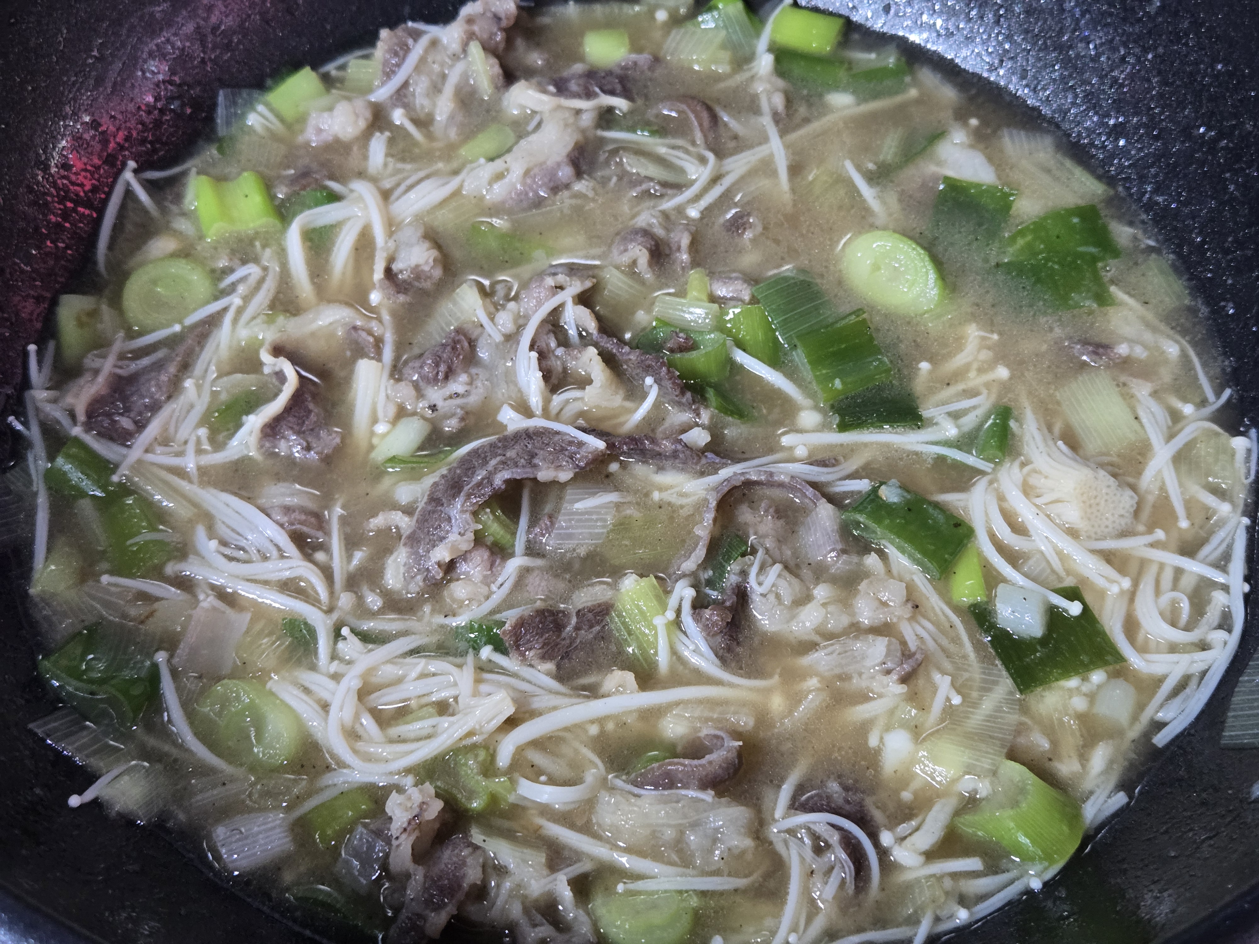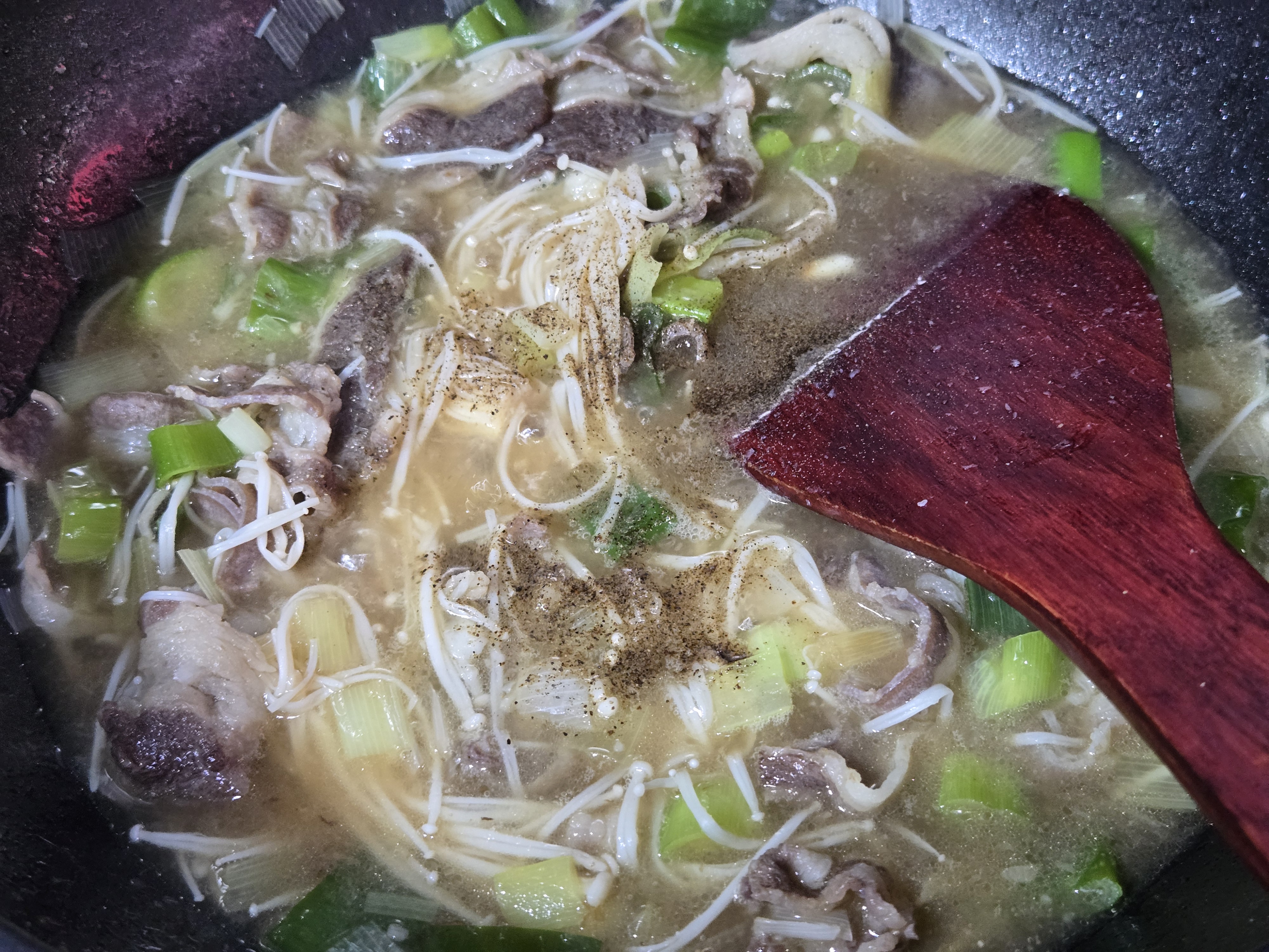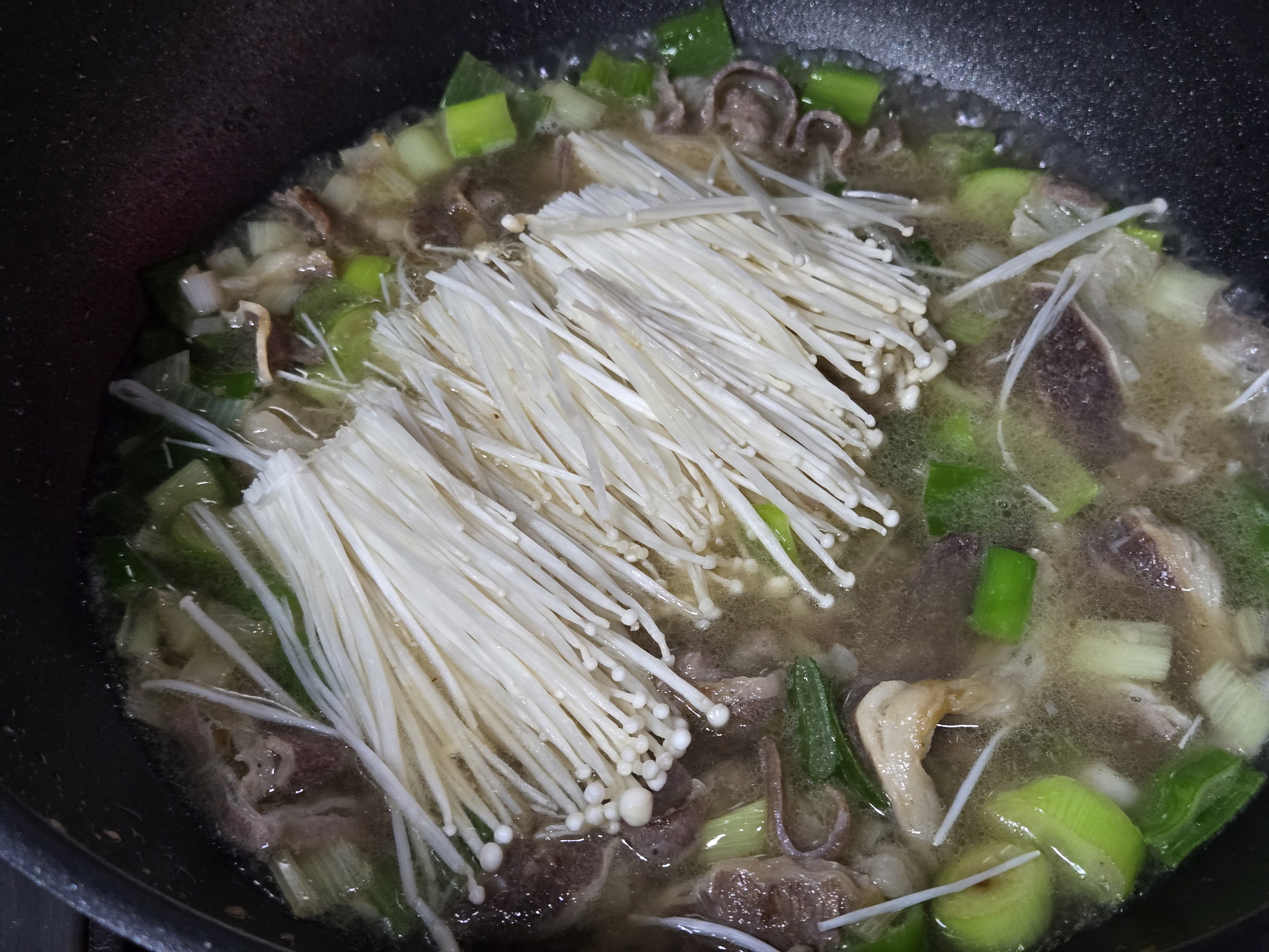 팽이버섯을 국물에 풀어주면서