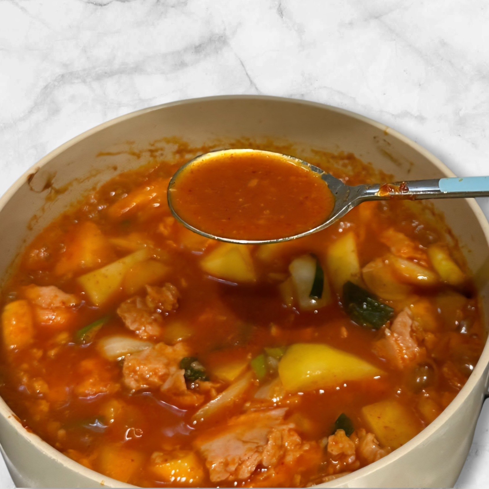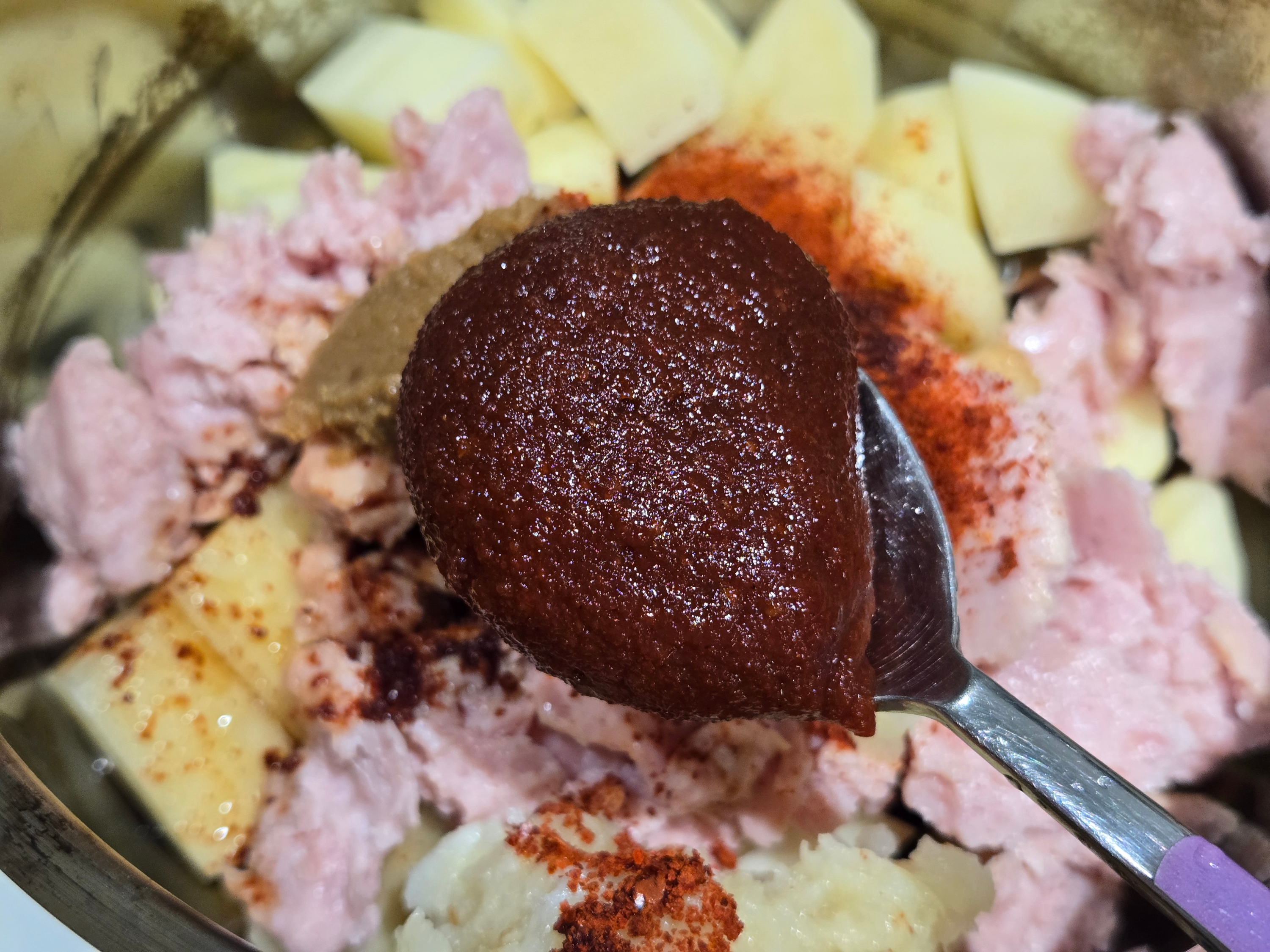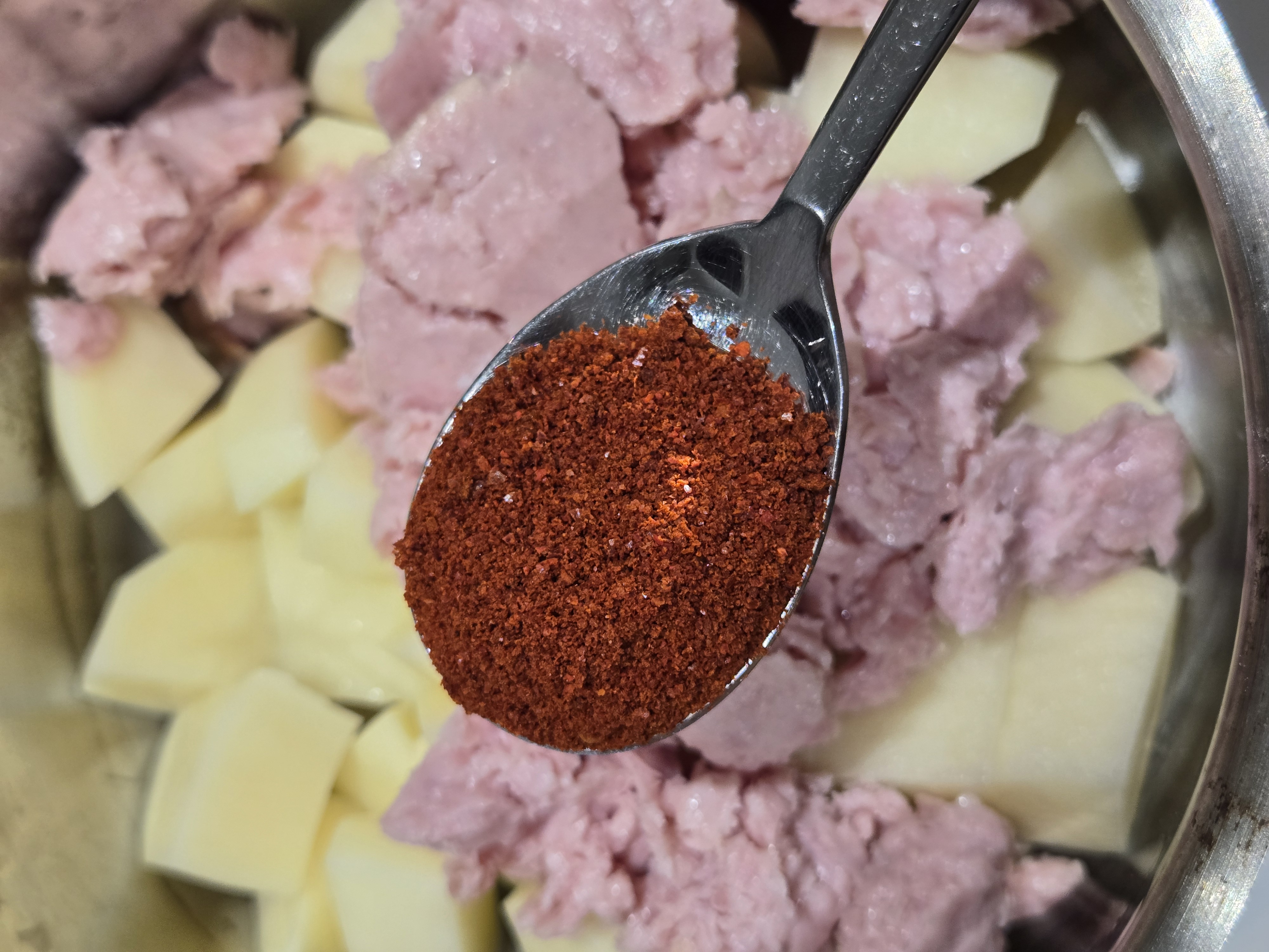 (냄비 안 : 감자/스팸/양파/파)