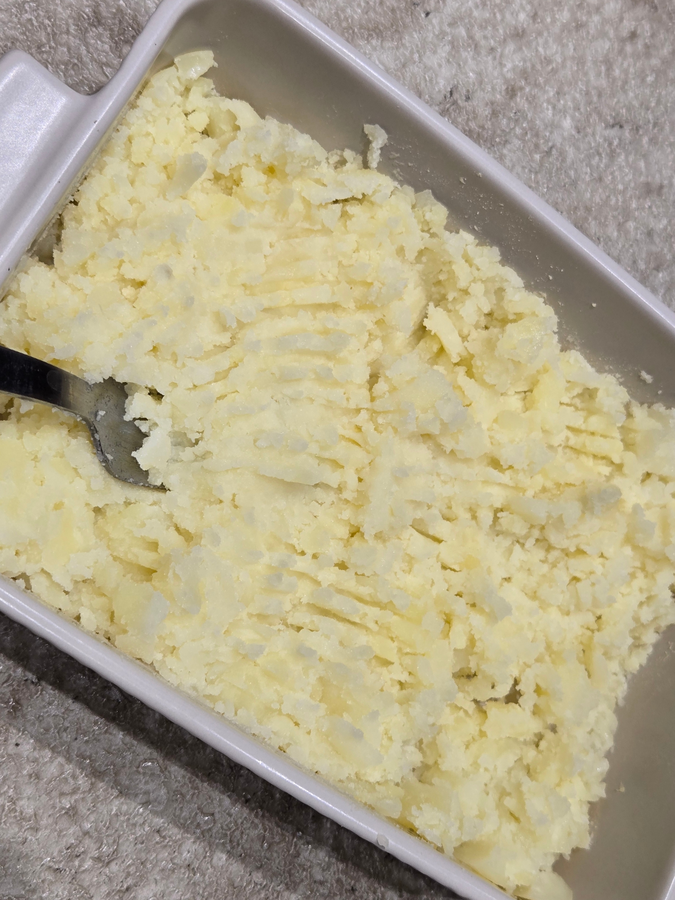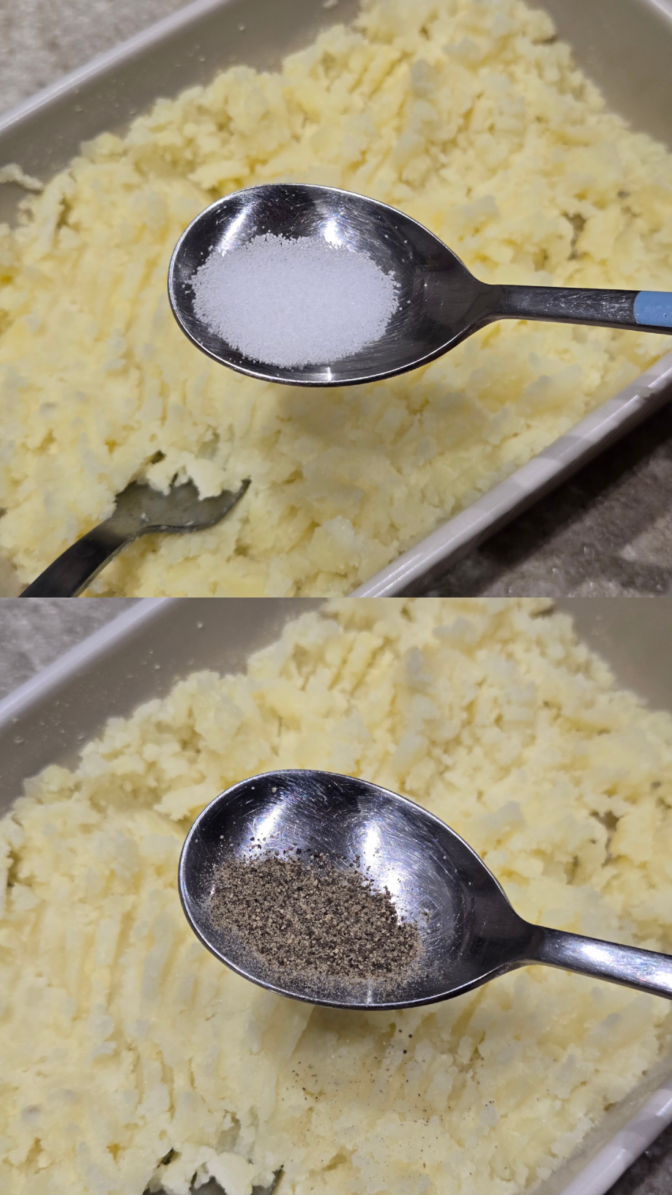 잘 익은 감자를 포크로 눌러 곱게 으깨주세요