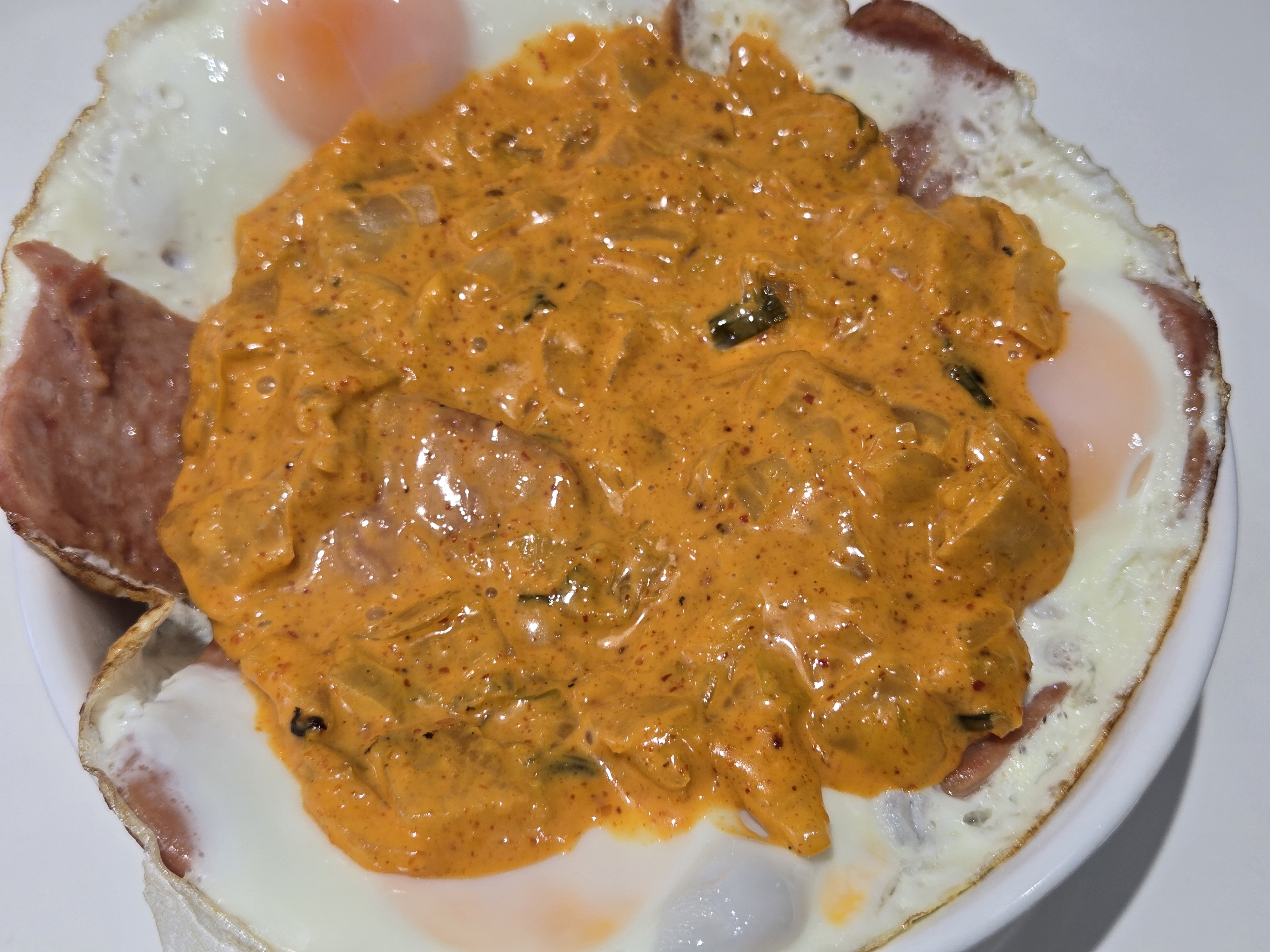 밥 한 공기 위에 구운 스팸과 계란을 올리고, 마지막으로 김치마요 소스를 듬뿍 얹어주세요