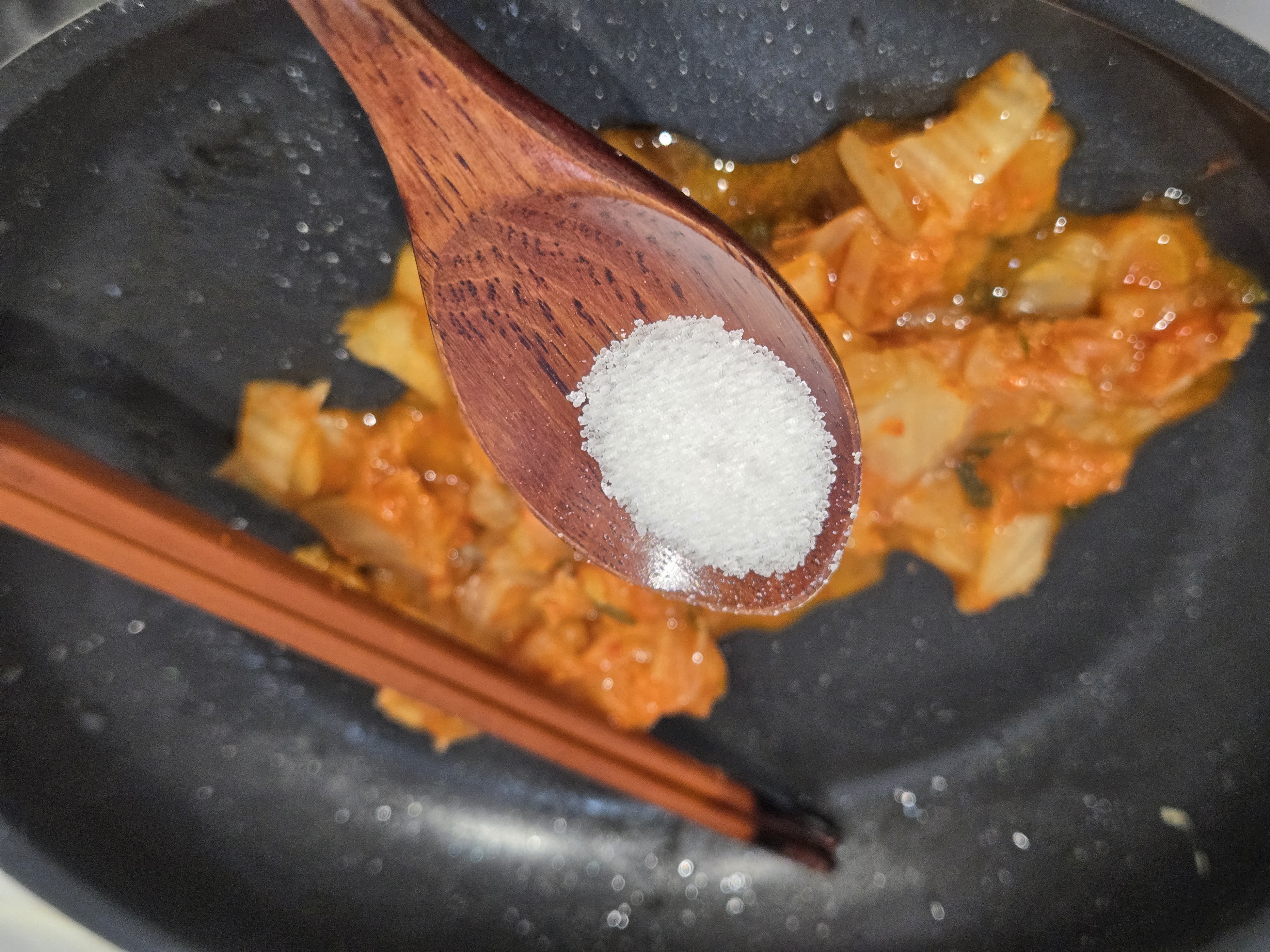 같은 팬에 잘게 다진 김치를 넣고 볶다가,