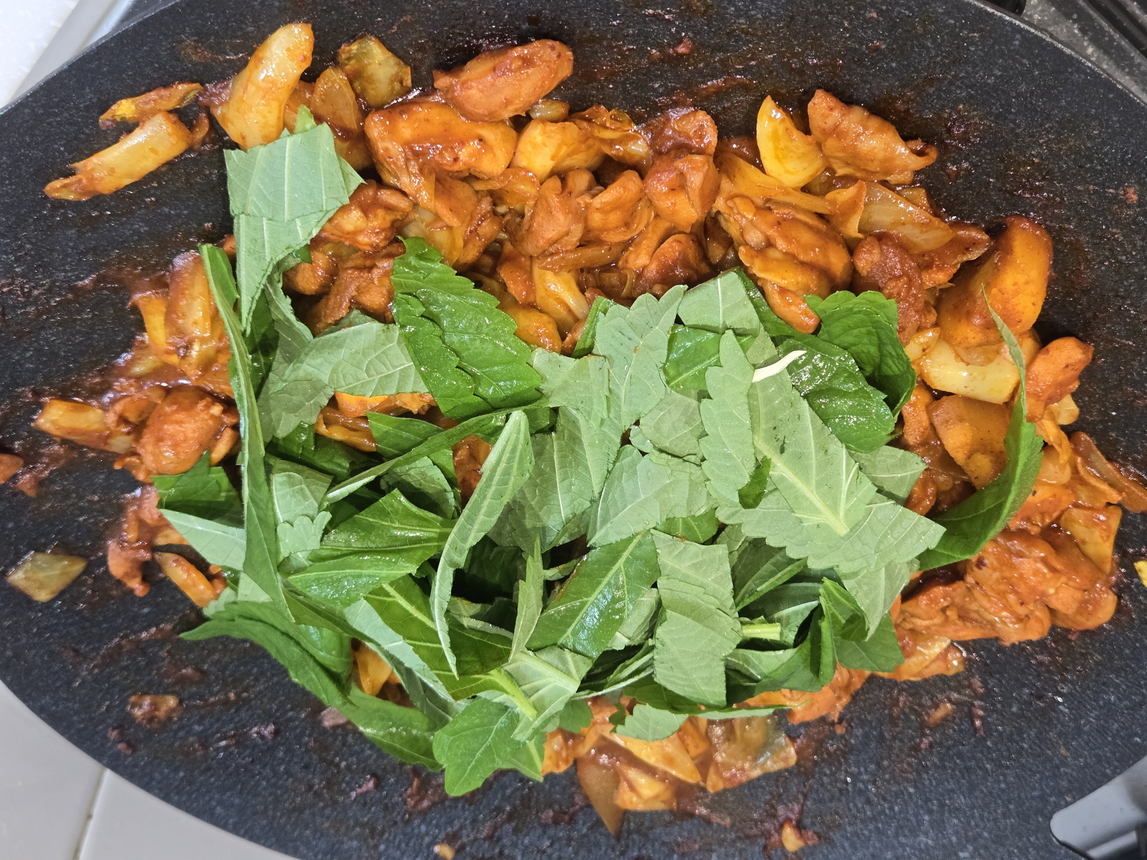 완성된 닭갈비 위에 깻잎을 송송 썰어 올리면
