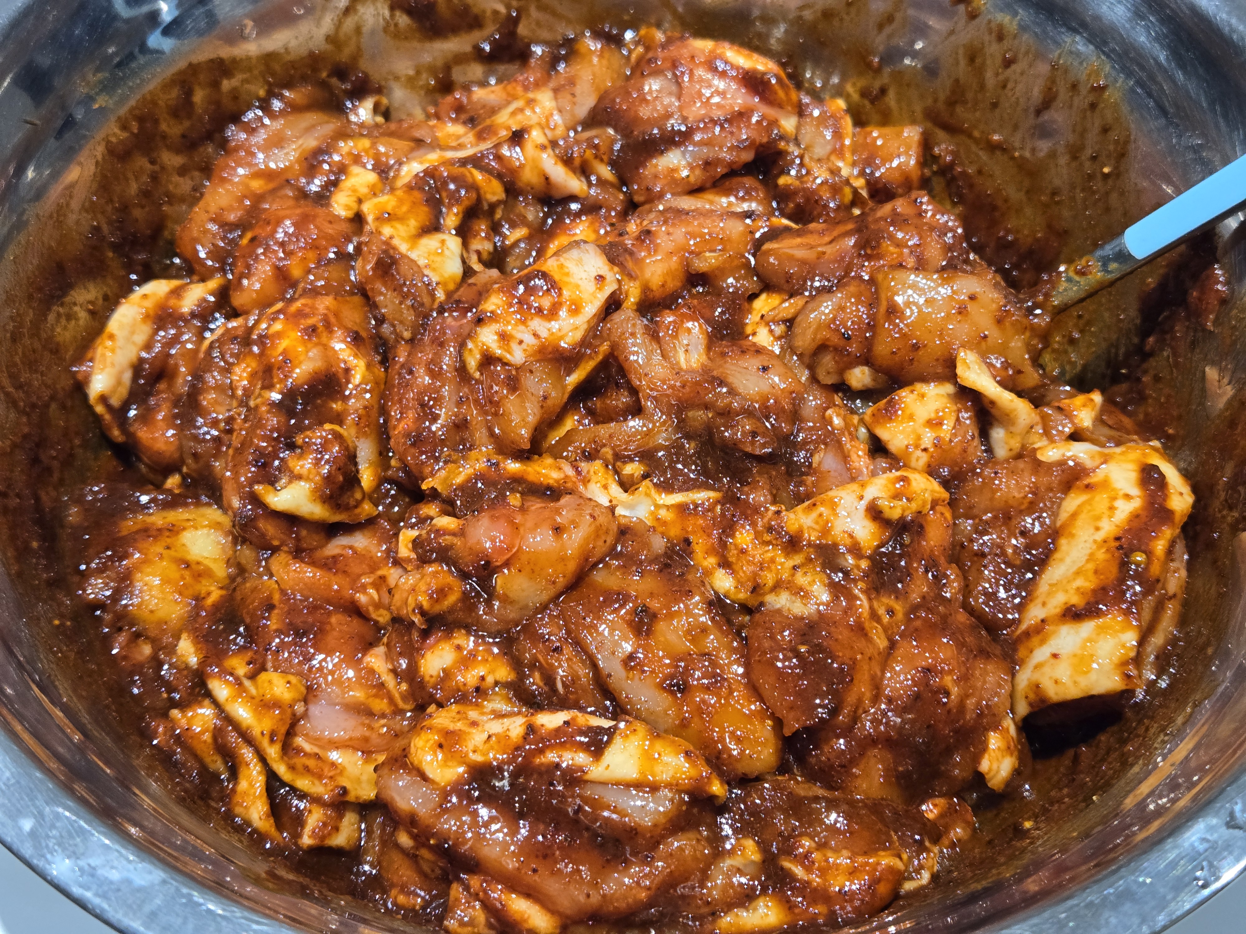 이제 양념에 재워둔 닭다리살을 넣고