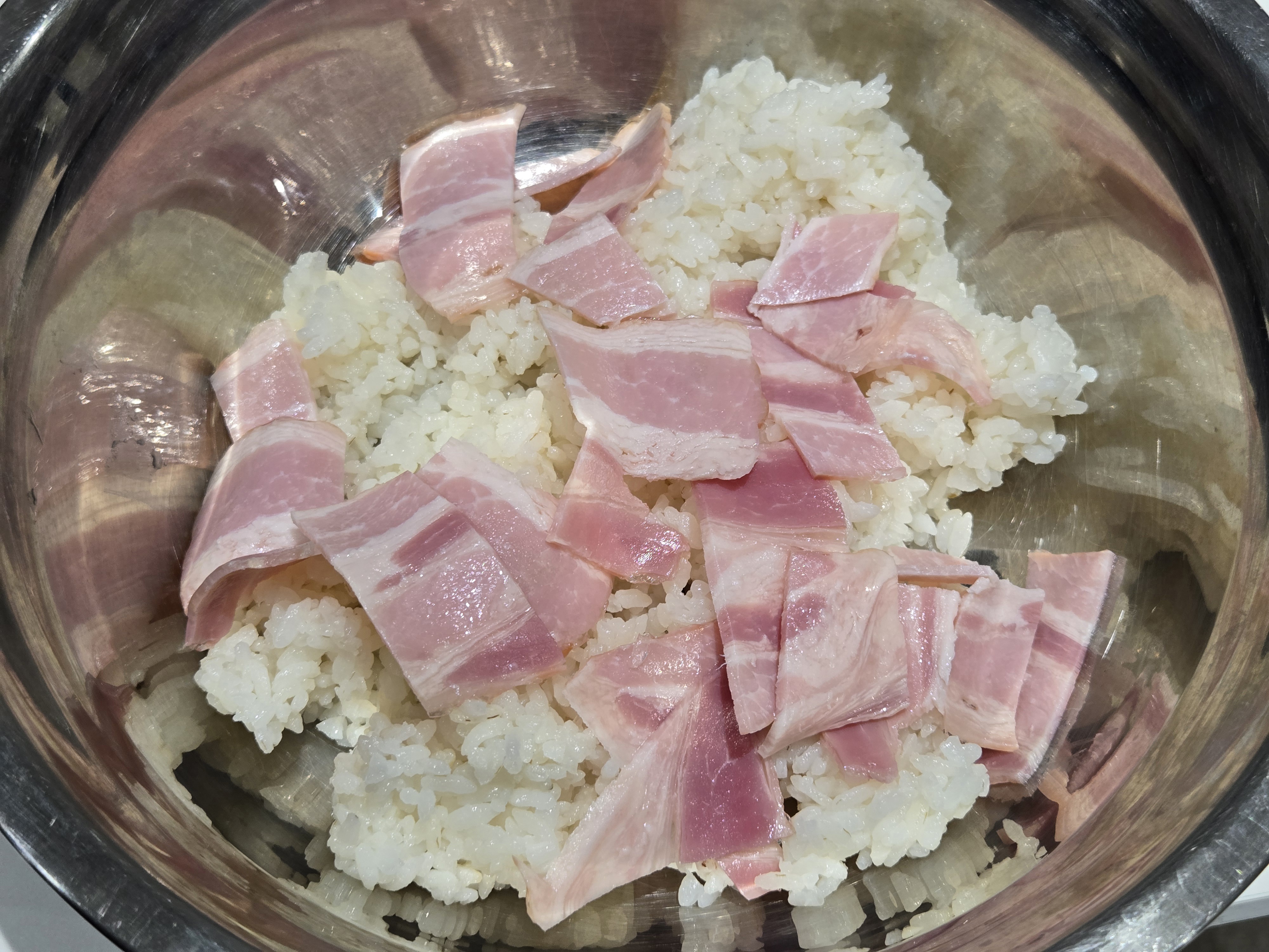 밥한공기에 베이컨 2줄 잘라넣기