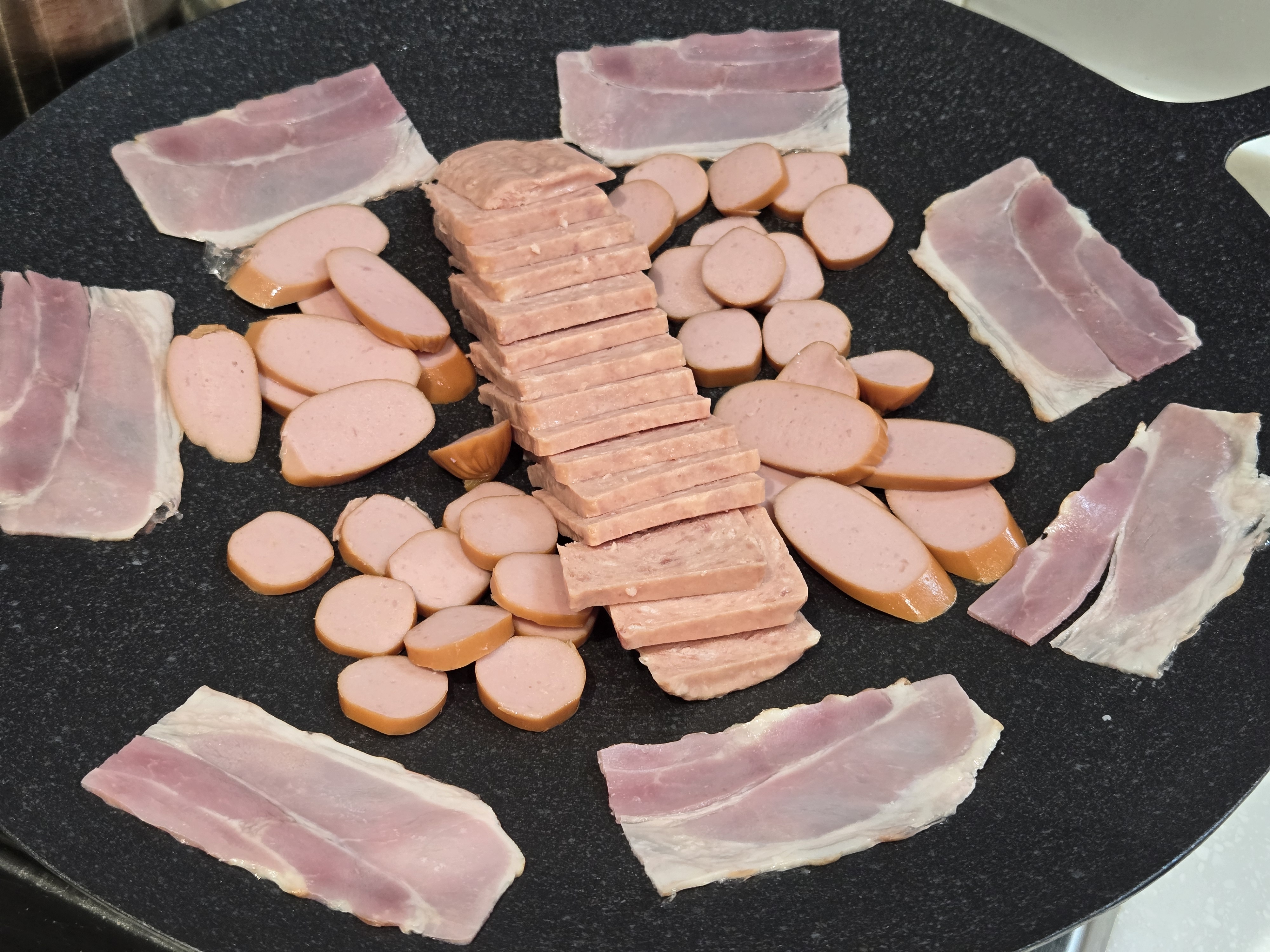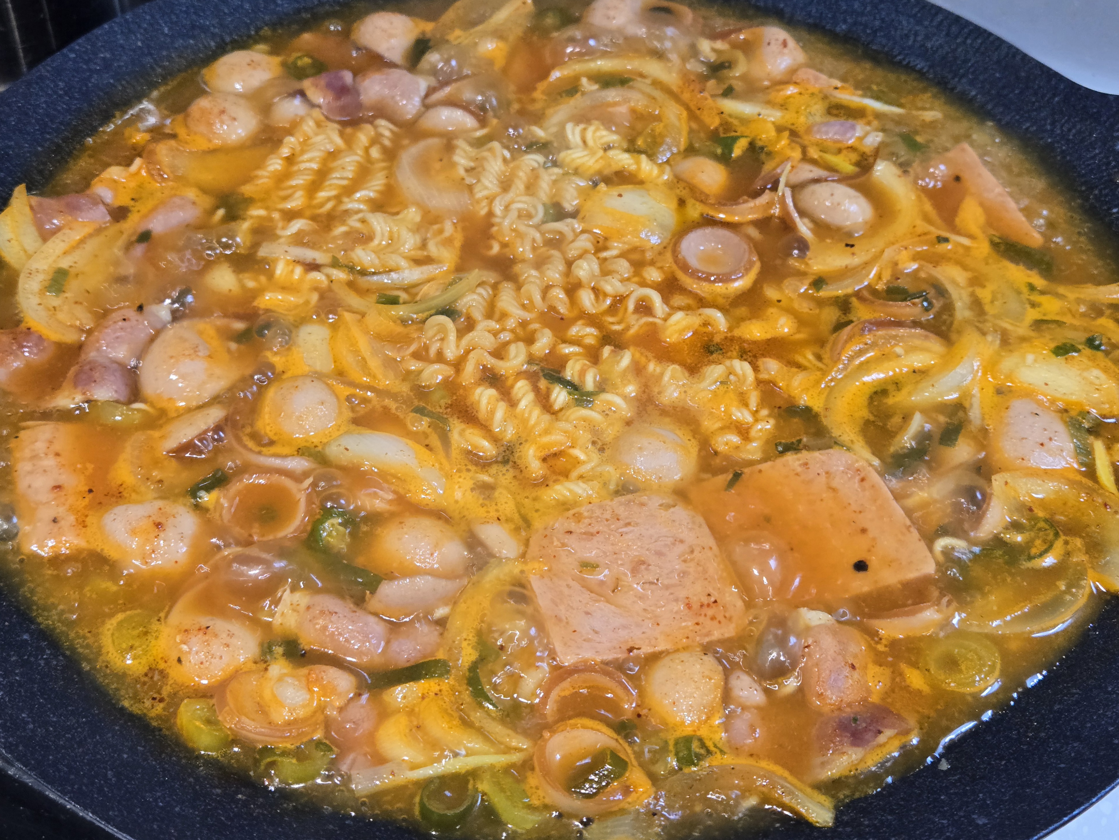 냄비 바닥에 스팸, 소세지,