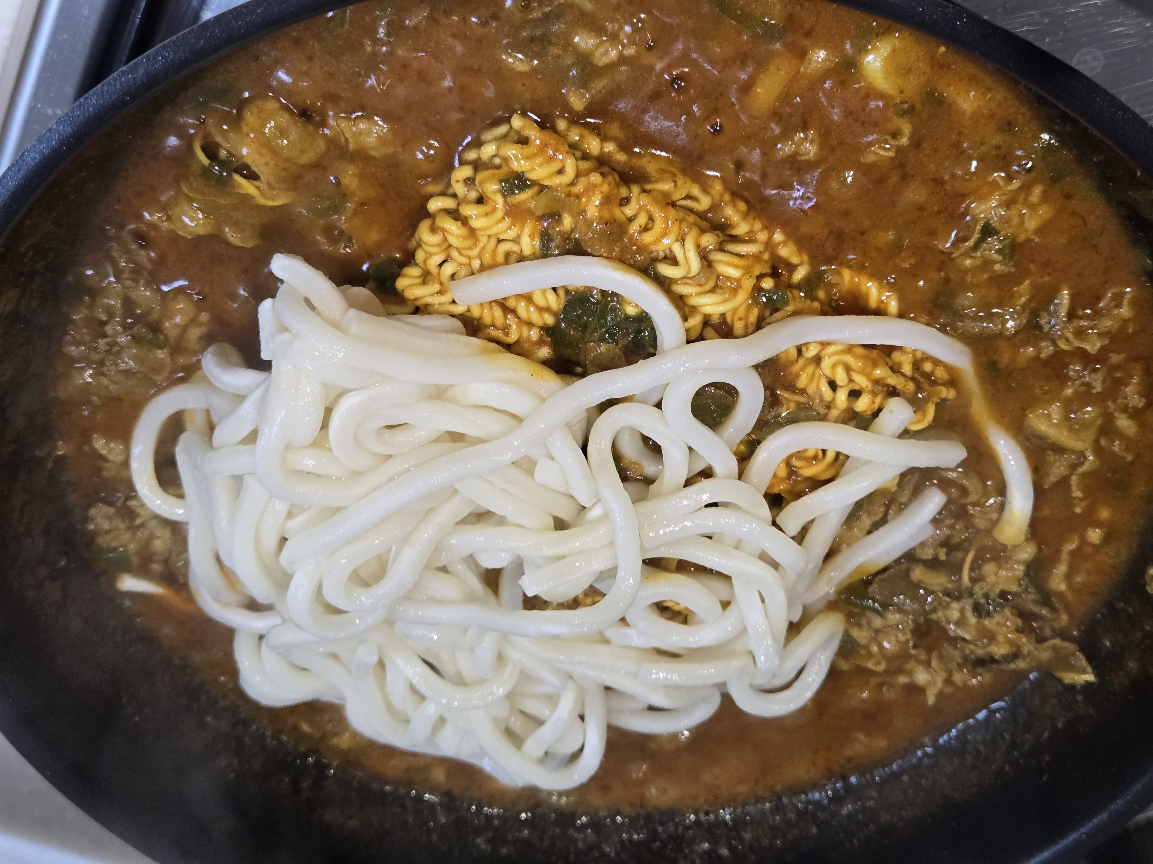 해동해둔 우동면을 넣고 2~3분 정도 졸여주세요