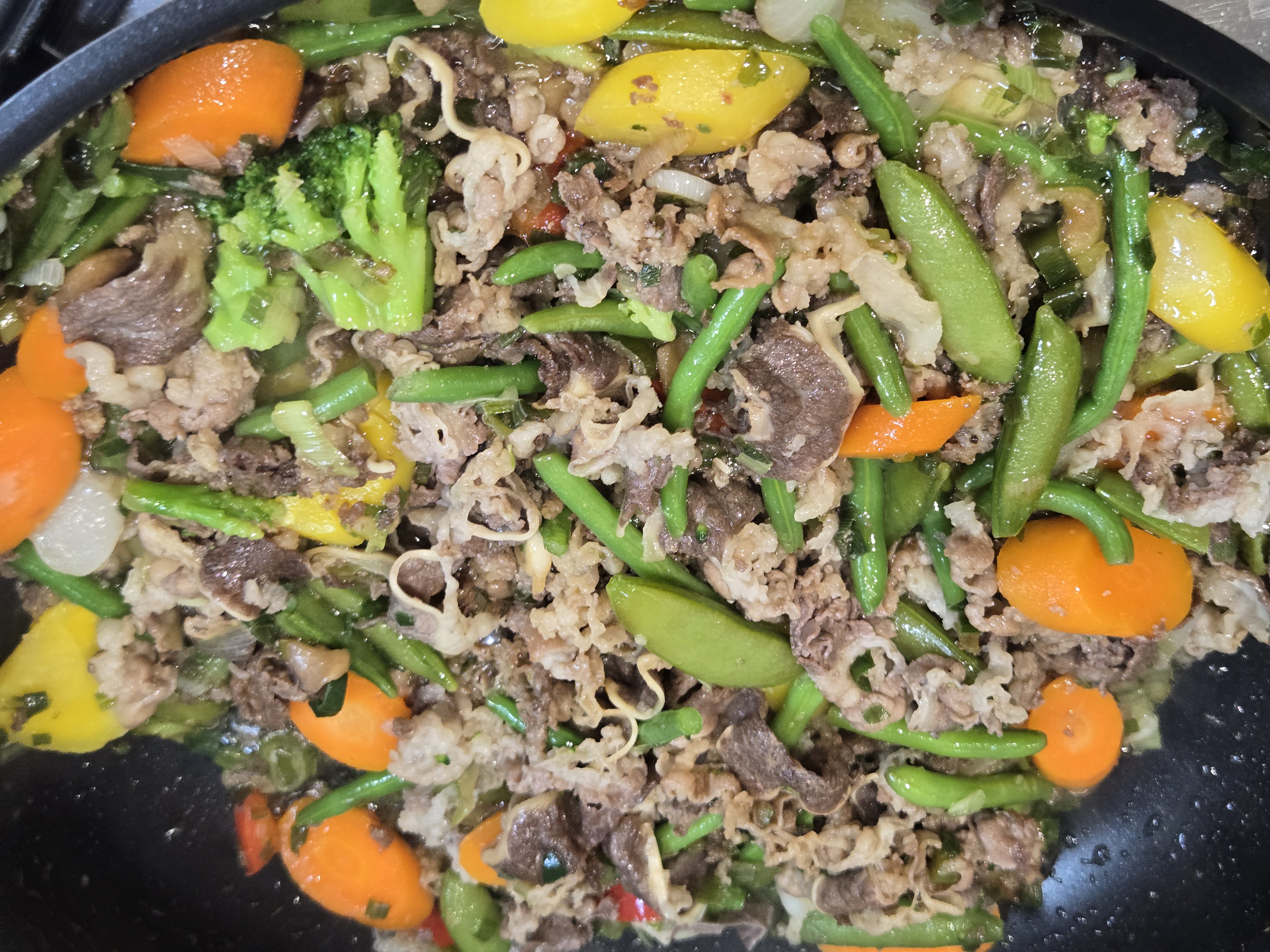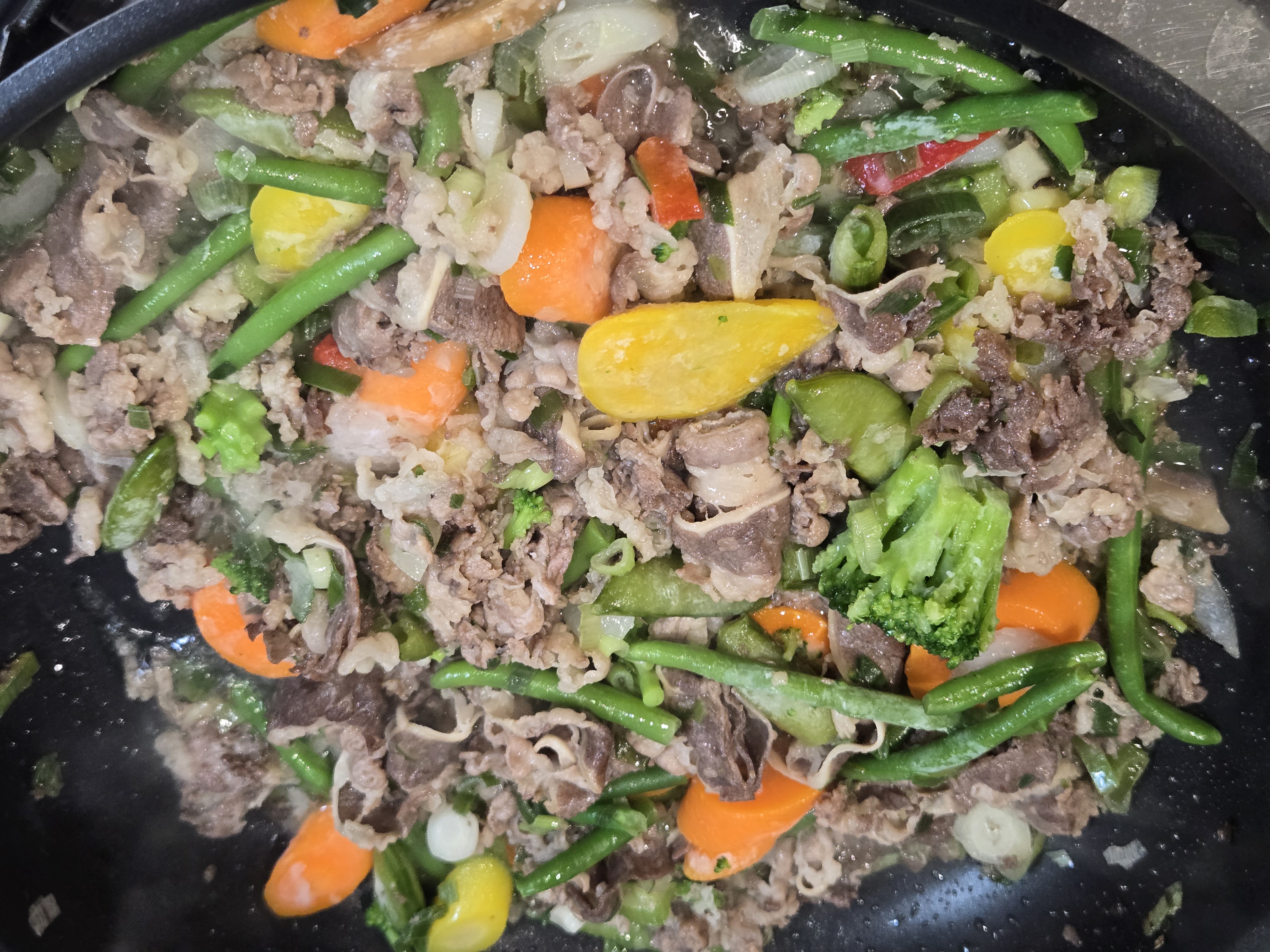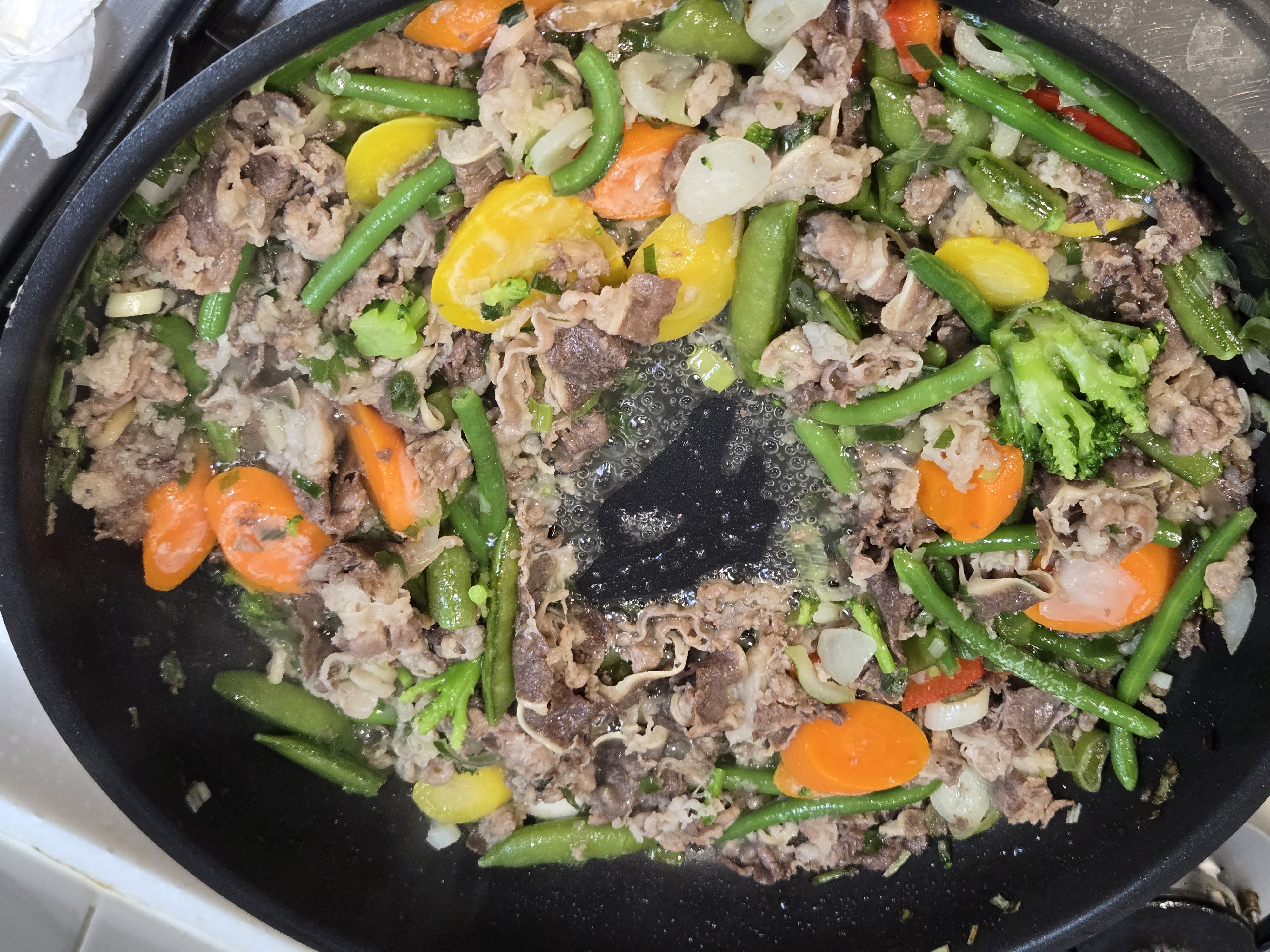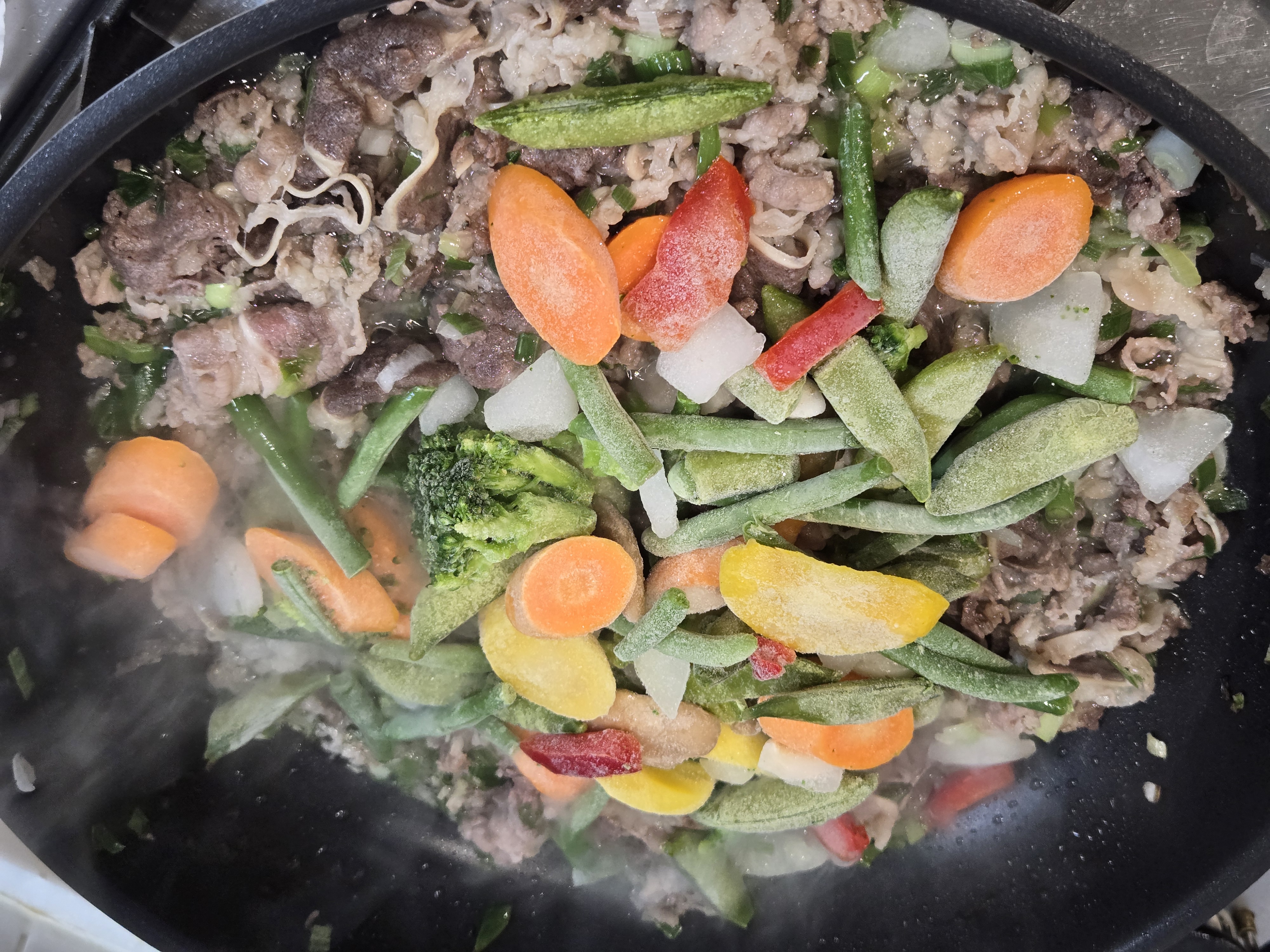 야채가 익으면 팬 한쪽을 비워서 틈을 만들고,