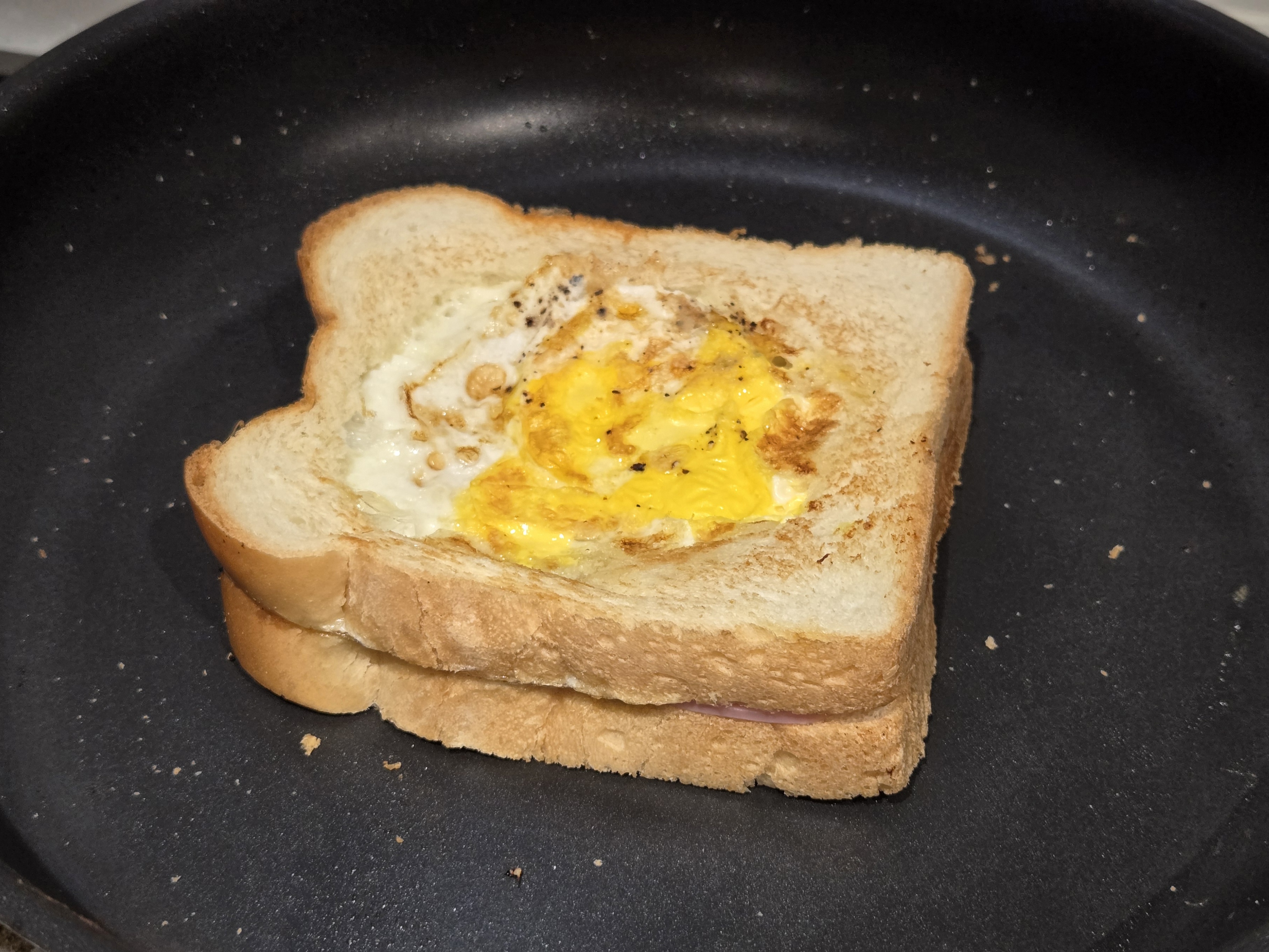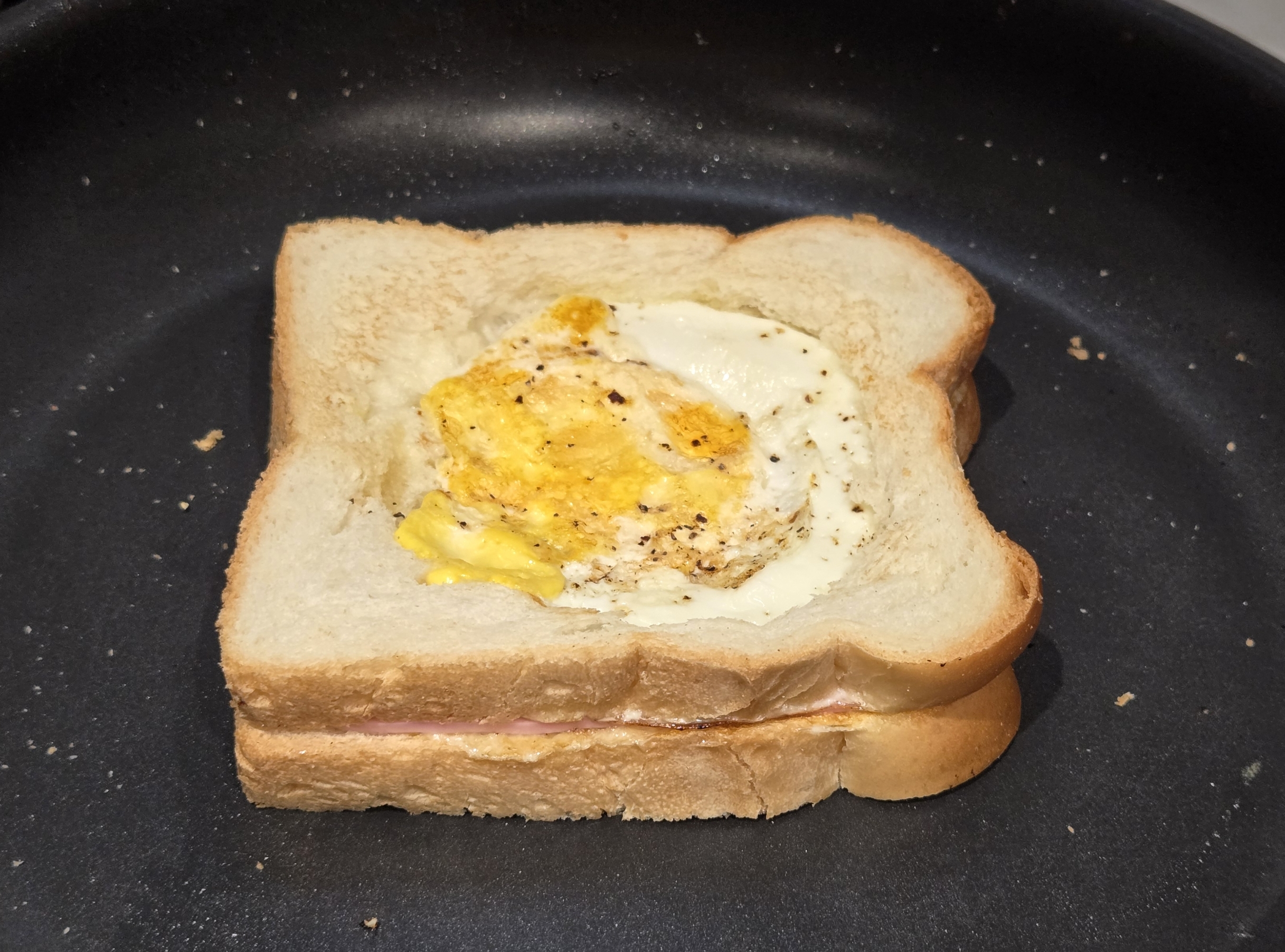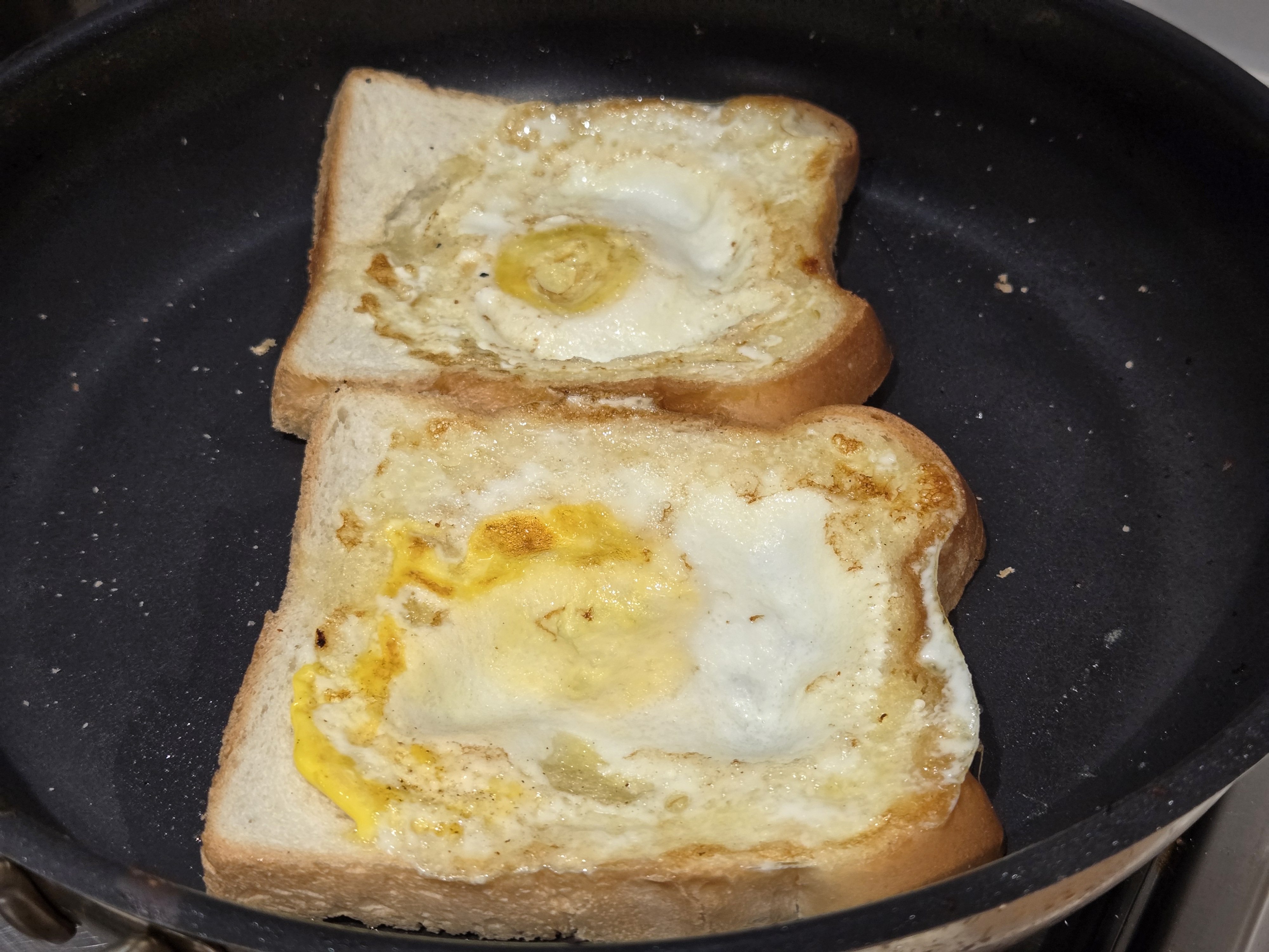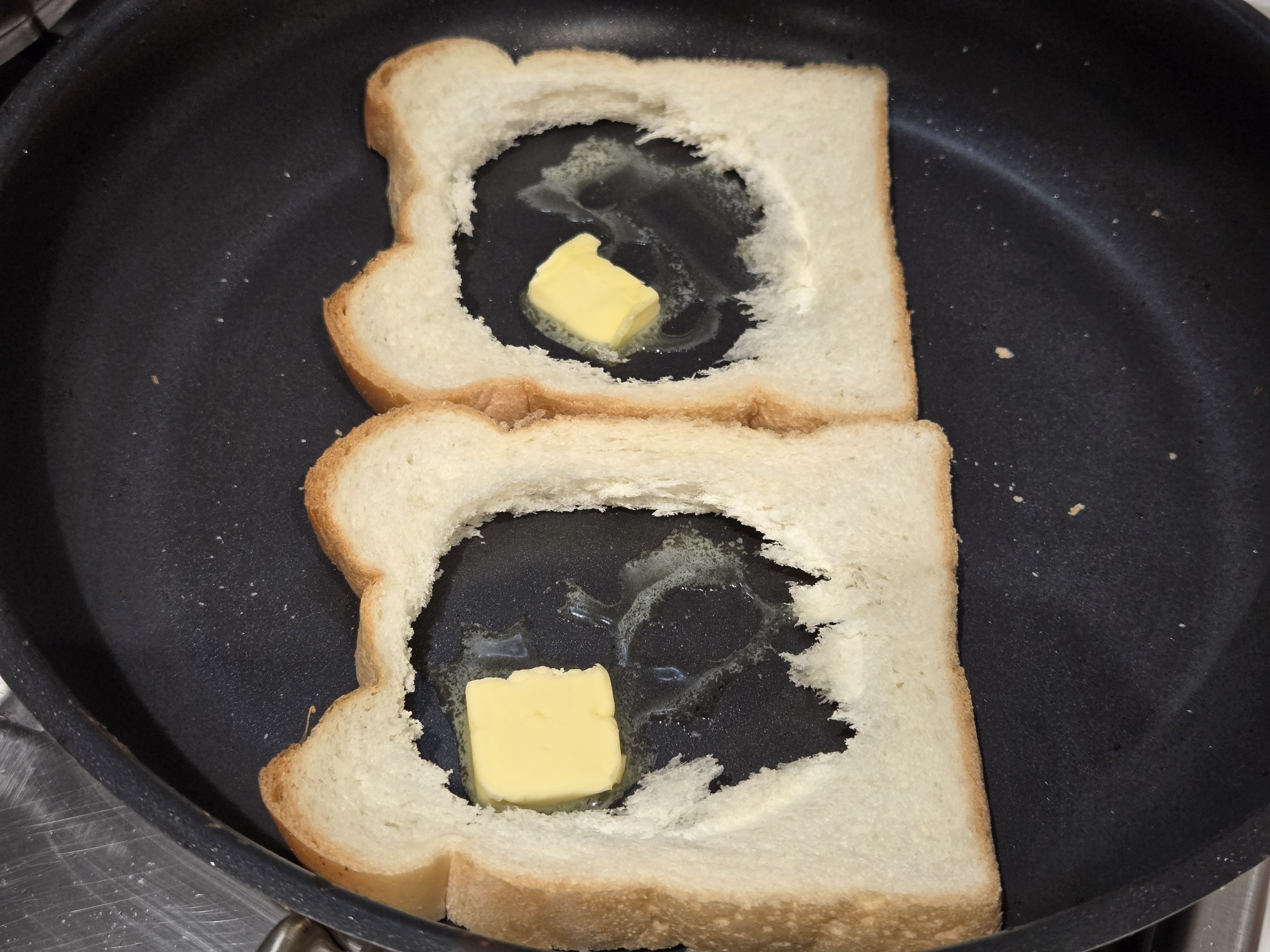 달군 팬에 뚫린 식빵을 먼저 올려두고,