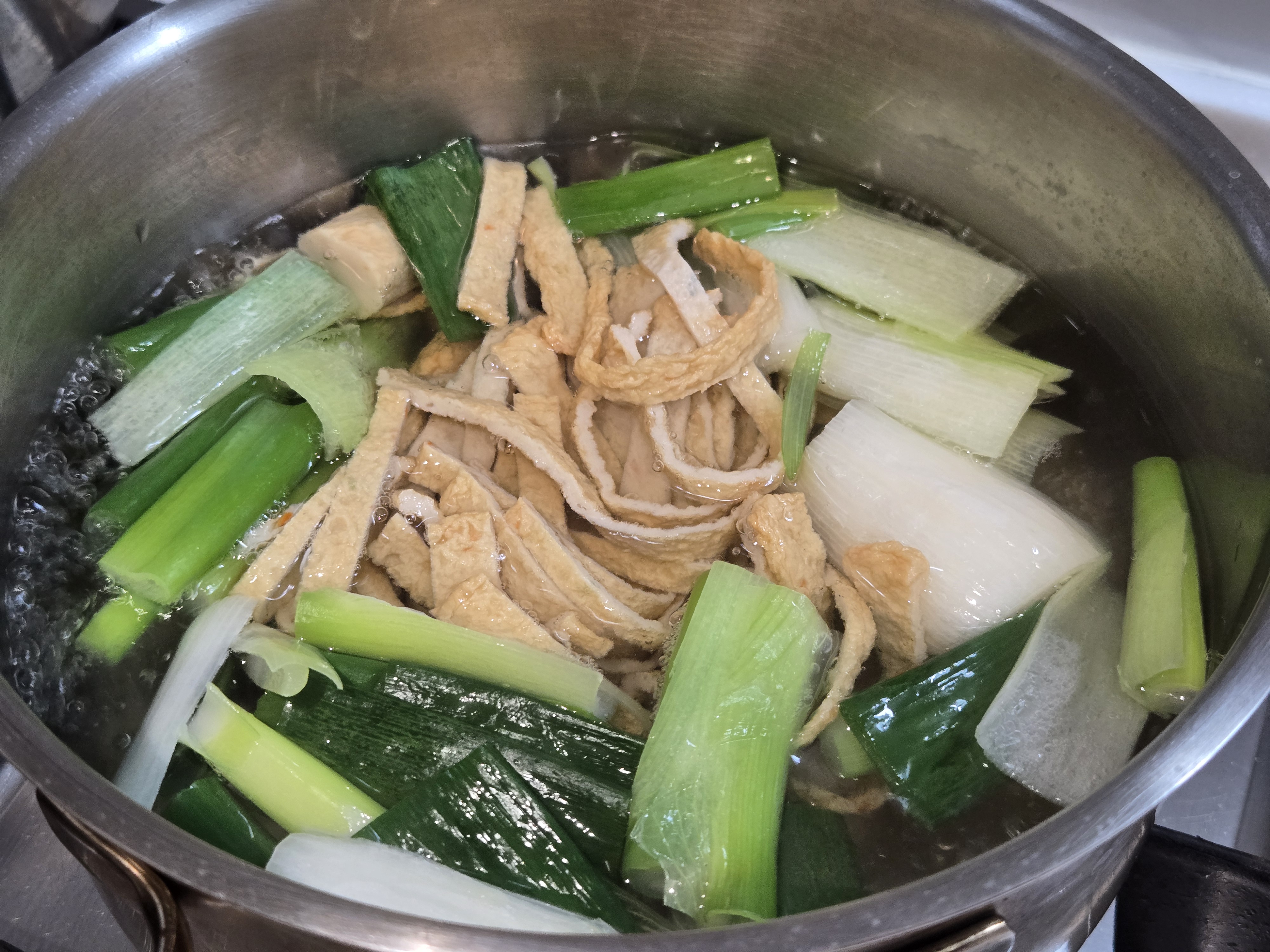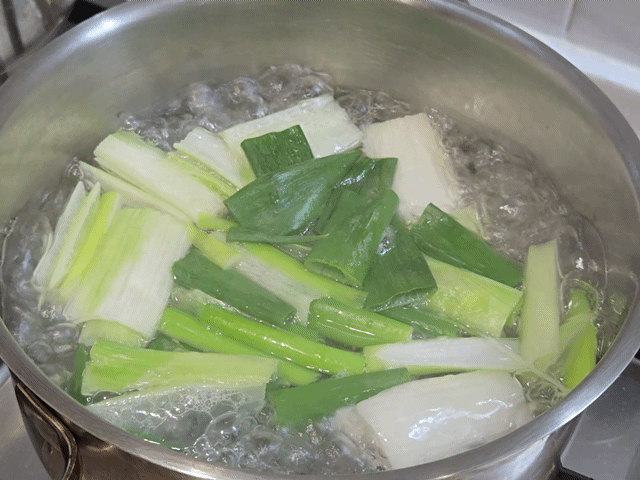 길게 썰어둔 대파를 먼저 넣고 끓여주세요