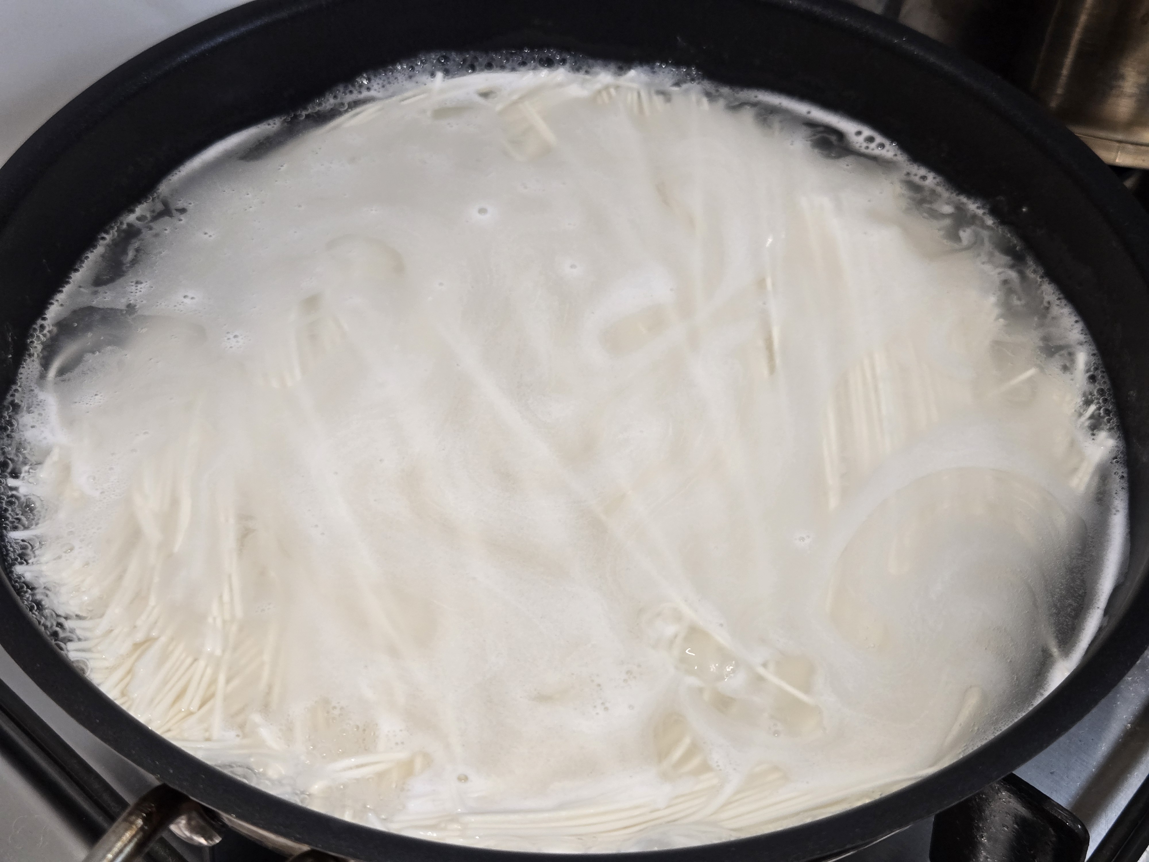 삶은 소면은 찬물에 여러 번 헹군 뒤,