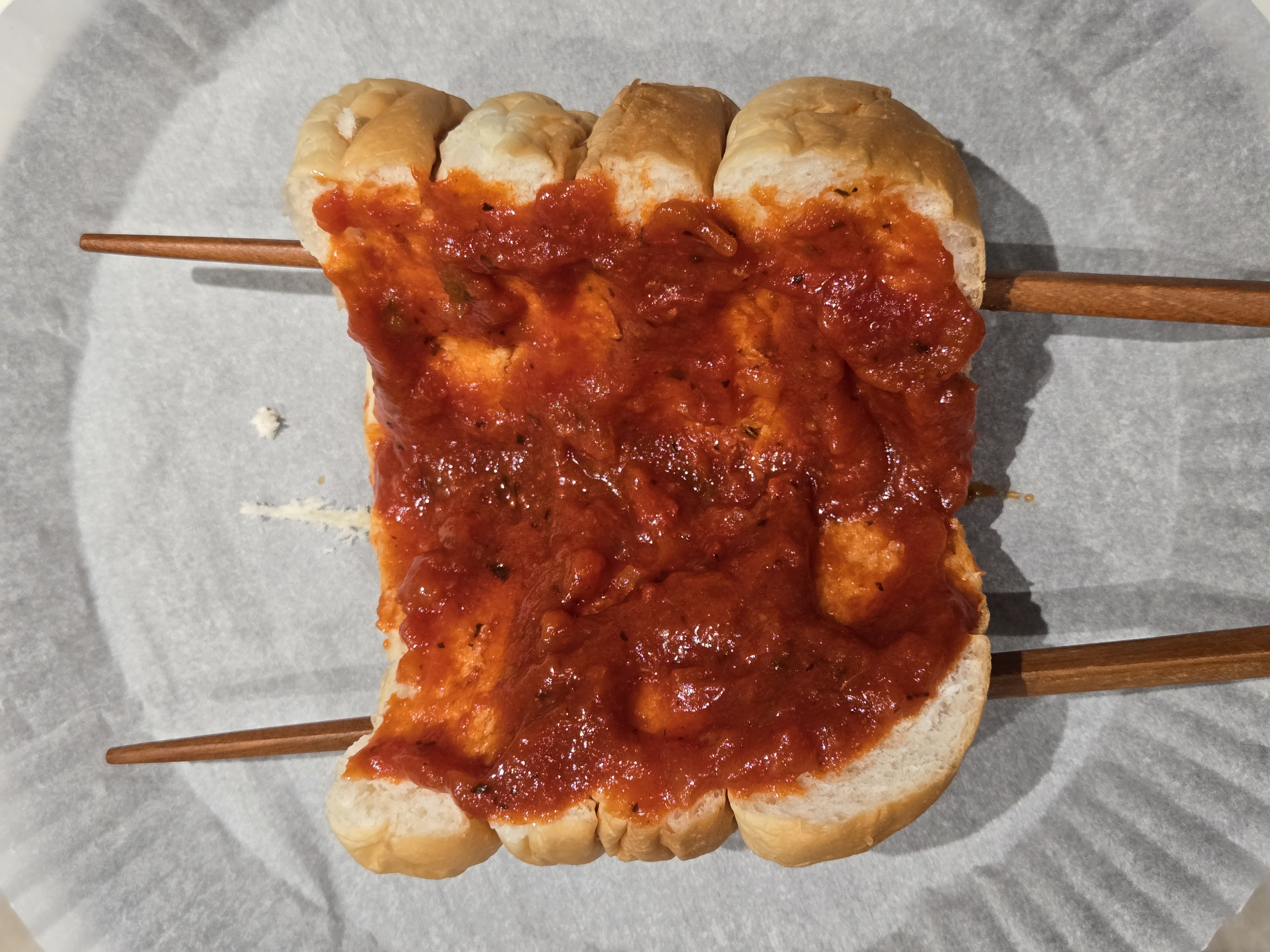 케찹이나 토마토소스를 얇게 펴 발라주세요