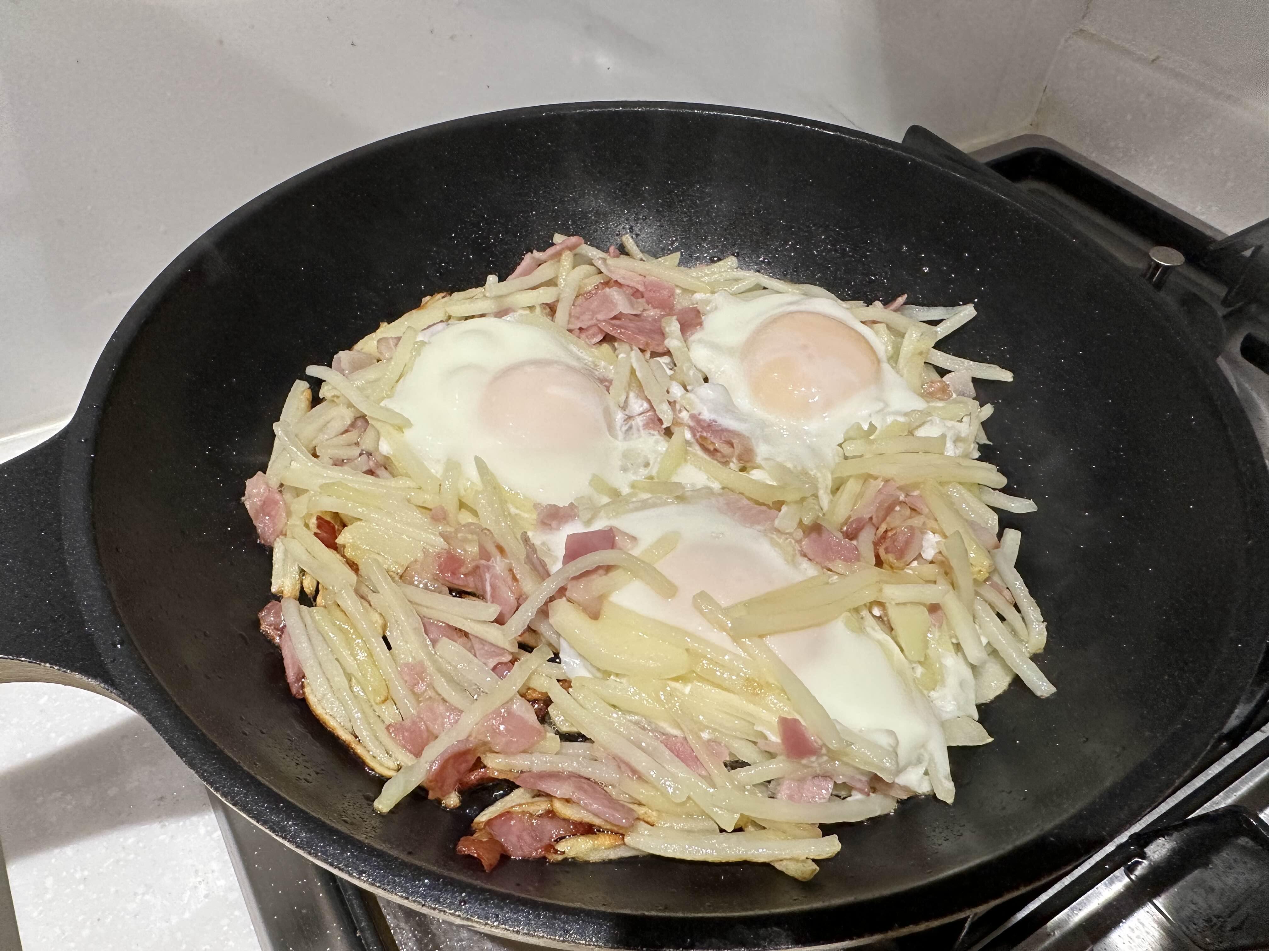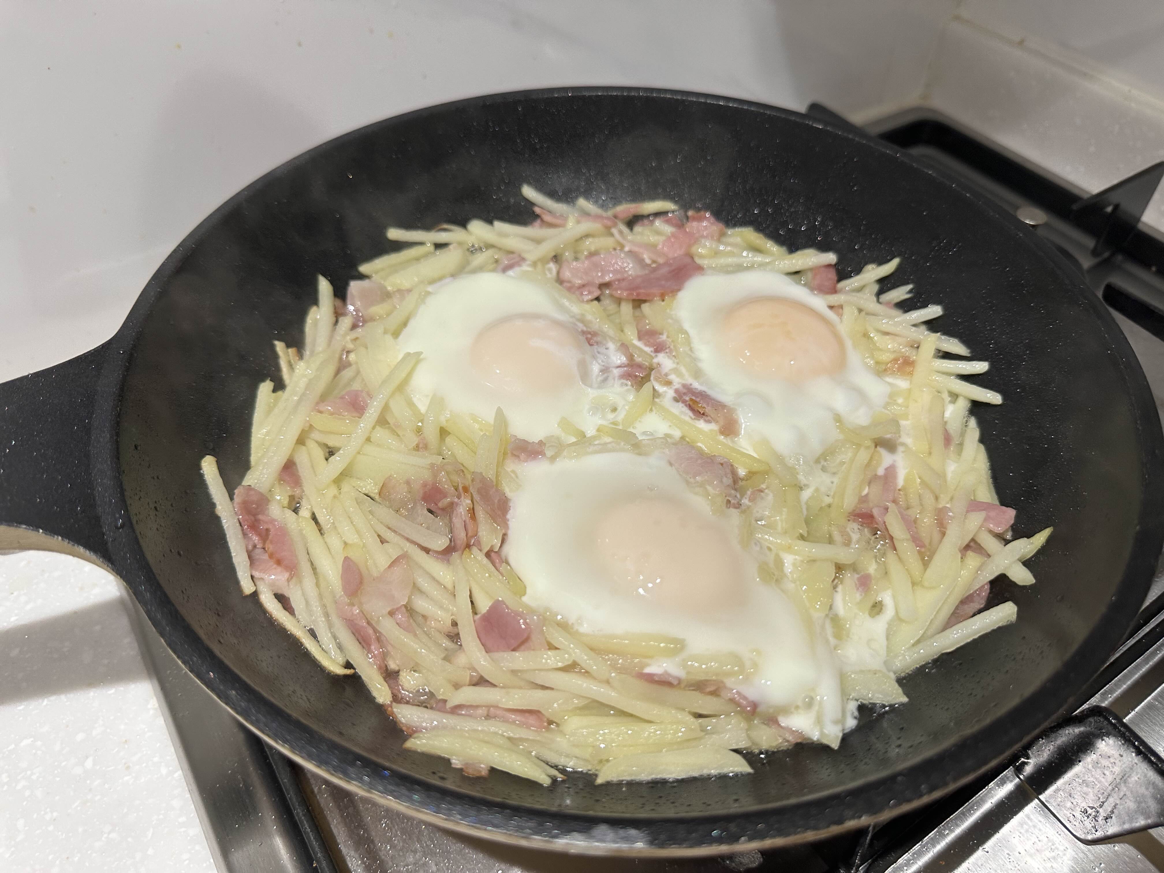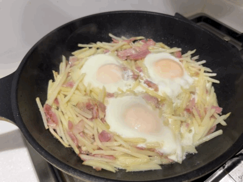 재료 : 감자 2-3개, 계란 3개, 소금 (옵션) 베이컨/소세지